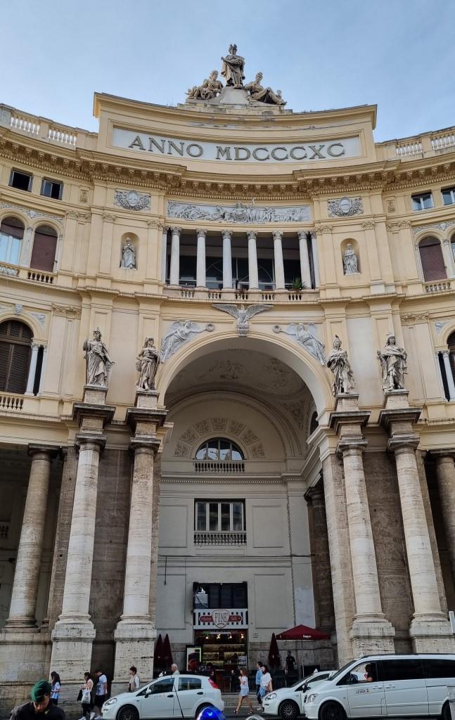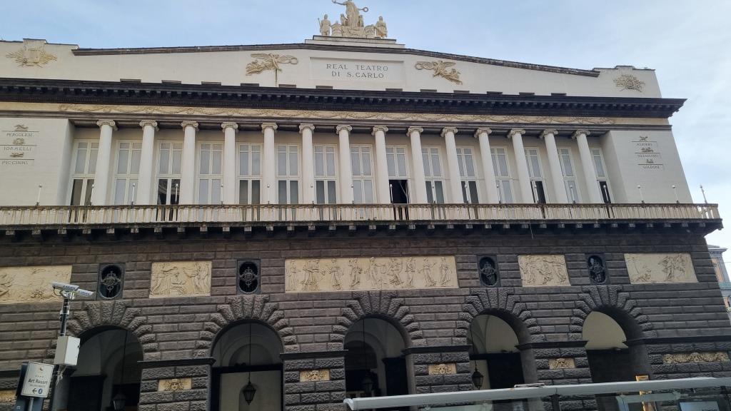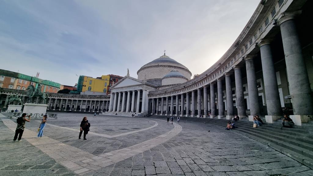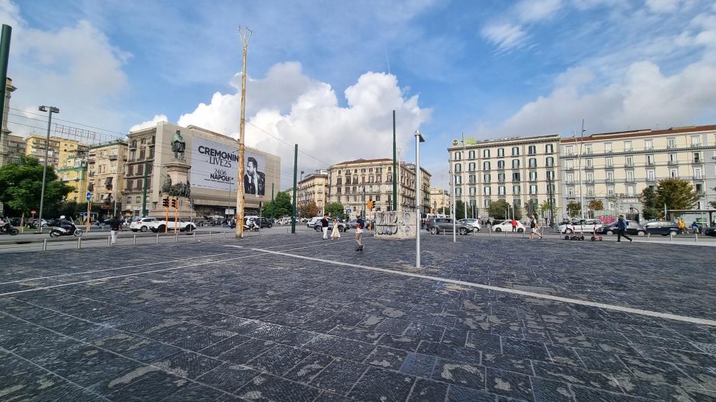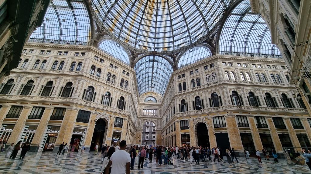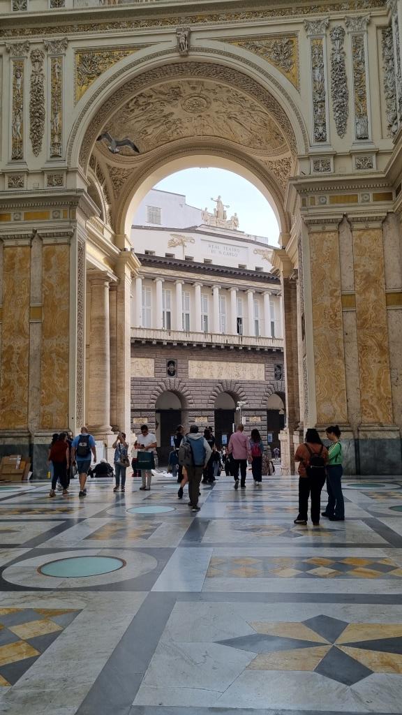 Nachdem wir genug Bilder von allen Seiten gemacht haben laufen wir zur Funiculare Centrale ein Stück hinunter und fahren mit dieser Standseilbahn ganz hinunter zur Galleria Umberto I. Diese Galleria ist ähnlich wie in Mailand. Eine überdachte Einkaufspassage aus dem Jahr 1891 mit schicken Restaurants und Boutiquen drin. Wieder draussen laufen wir am Theater San Carlo vorbei und kommen zur Piazza del Plebiscito. Ein riesiger Platz auf dem vor ein paar Tage das Treffen der Verteidigungsminister stattfand. Deshalb stehen ein paar Zelte noch auf dem Platz und man kann ihn nicht so schön fotografieren.