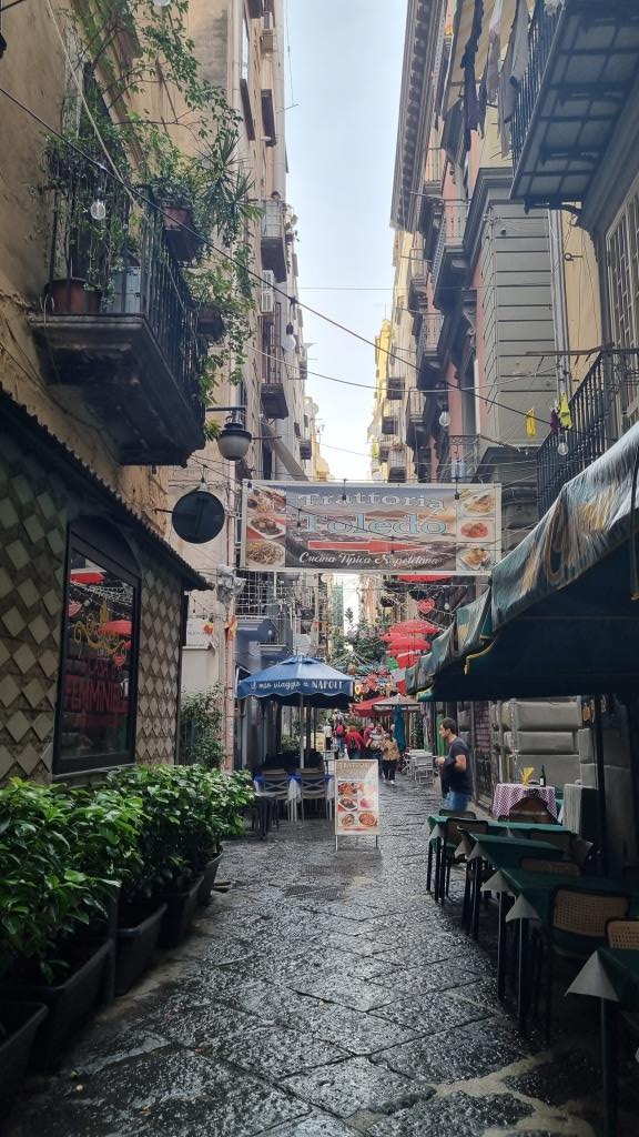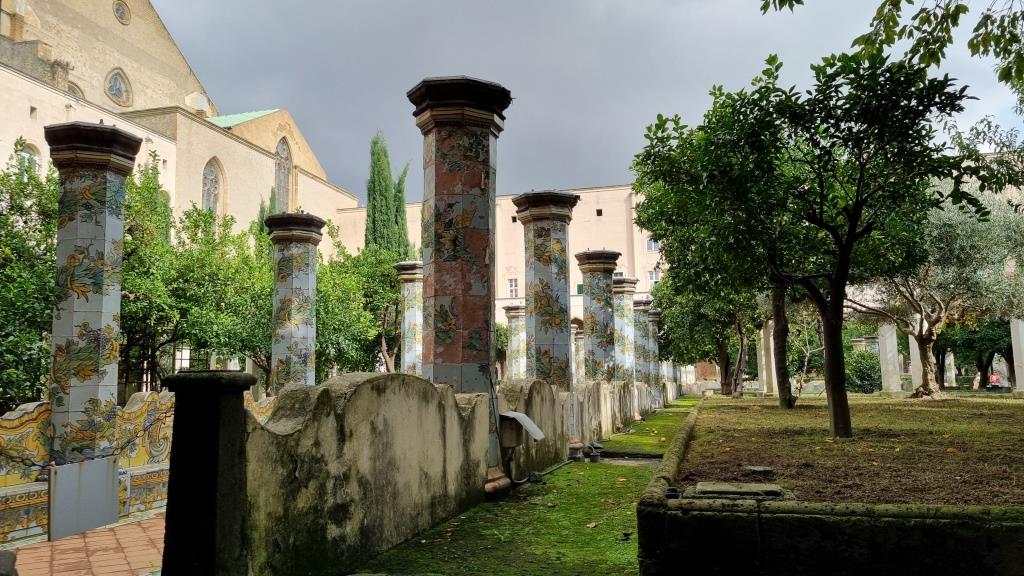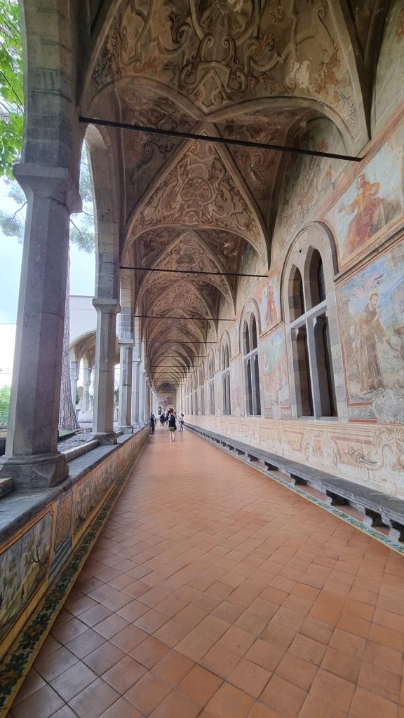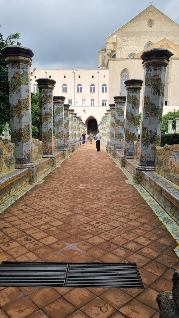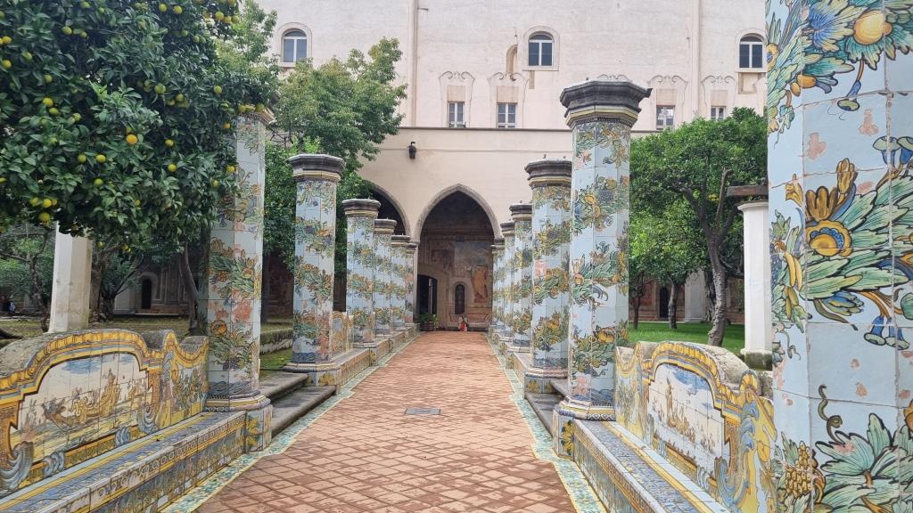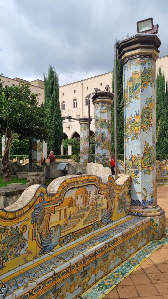 Wir laufen auf der Spaccanapoli, was soviel heisst wie Napoli auseinanderbrechen, weil die Gasse schnurgerade durch Napoli verläuft und staunen über dies und das. Bei der Basilika Santa Chiara besichtigen wir den einmaligen Kreuzgang, der mit Majolika Fliesen geschmückt ist. Ein ruhiger, schöner Ort in der trubeligen, lauten Stadt zum Durchatmen.