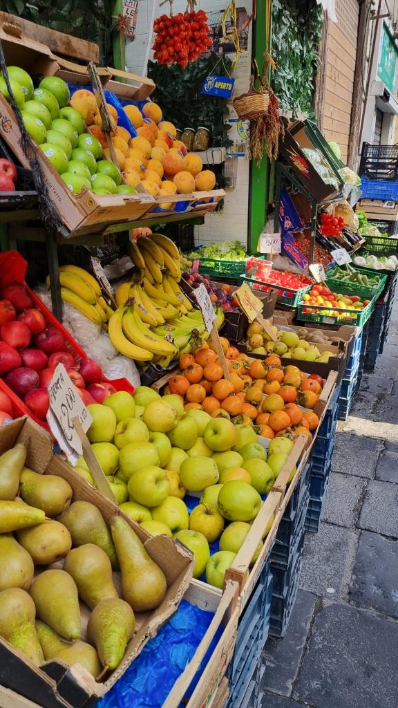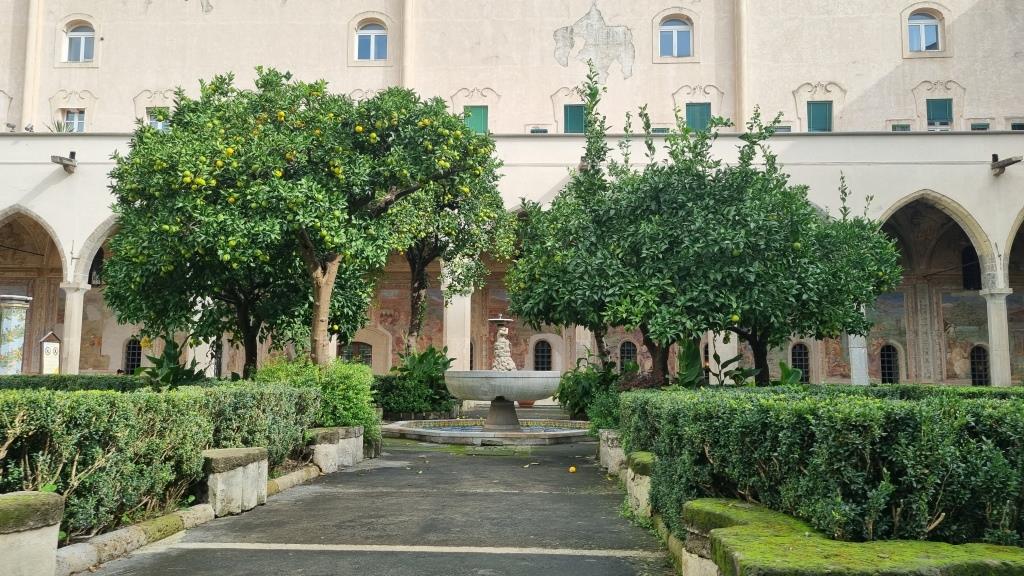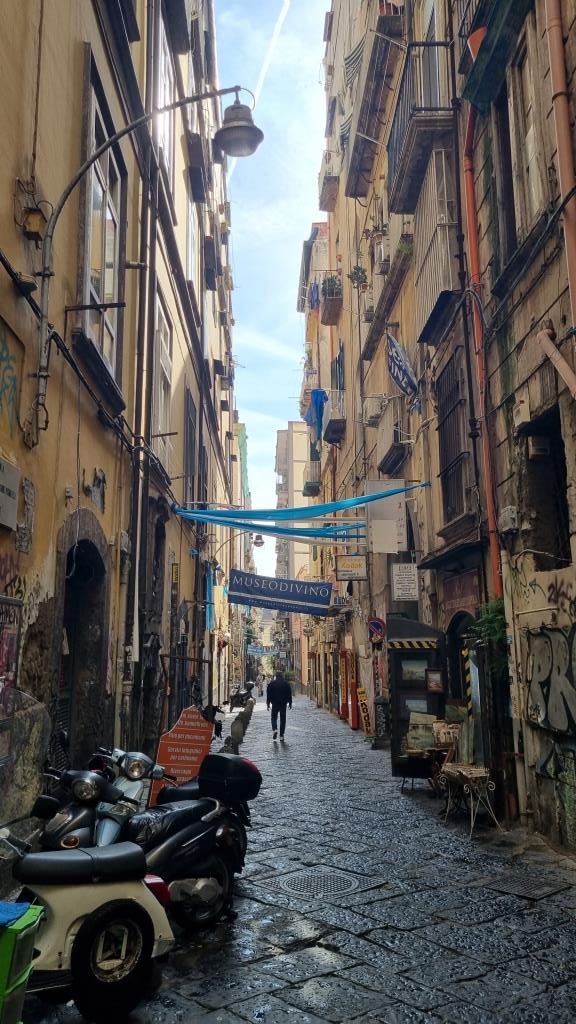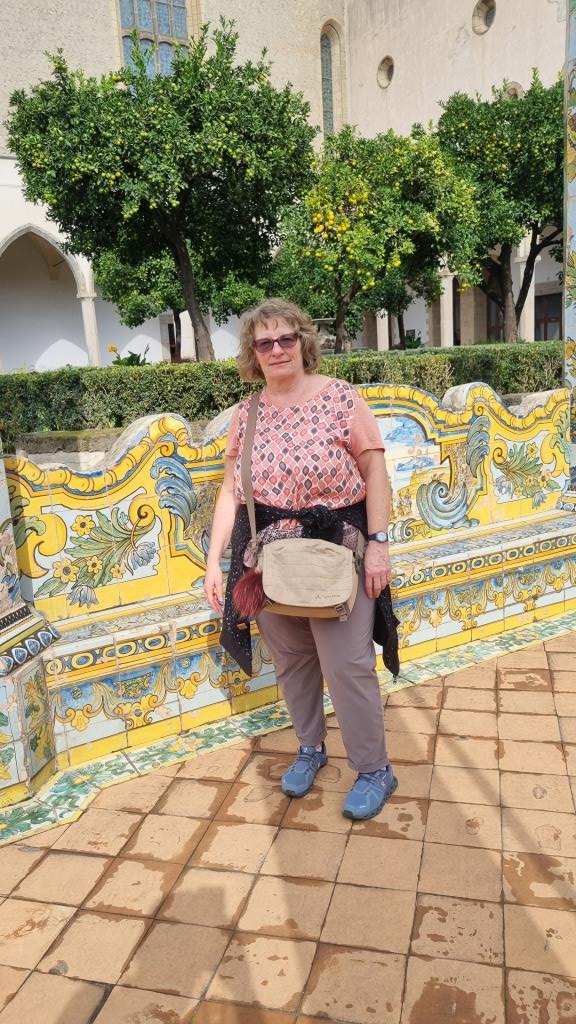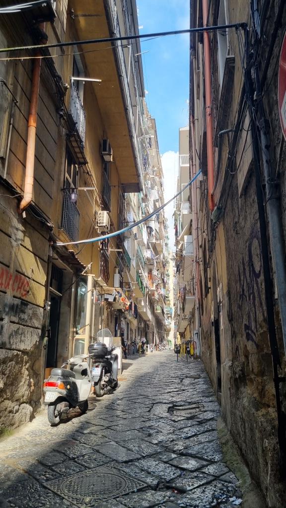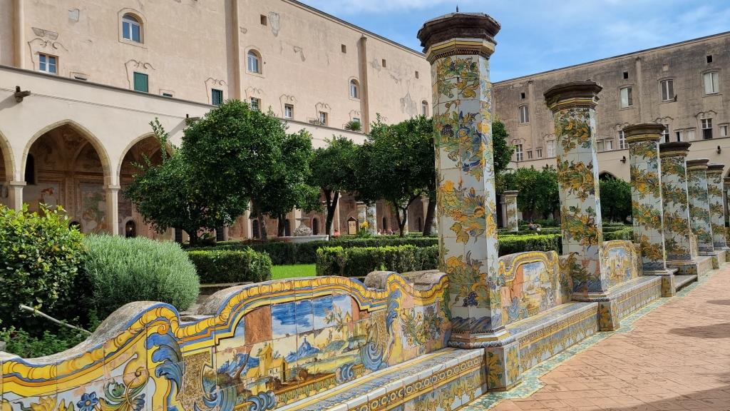 Wir laufen auf der Spaccanapoli, was soviel heisst wie Napoli auseinanderbrechen, weil die Gasse schnurgerade durch Napoli verläuft und staunen über dies und das. Bei der Basilika Santa Chiara besichtigen wir den einmaligen Kreuzgang, der mit Majolika Fliesen geschmückt ist. Ein ruhiger, schöner Ort in der trubeligen, lauten Stadt zum Durchatmen.