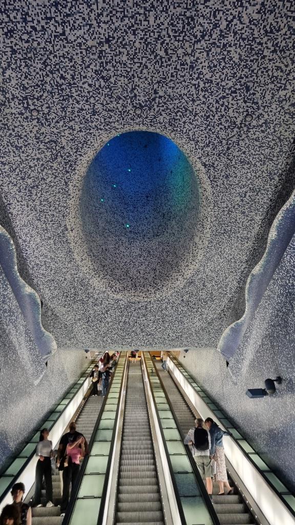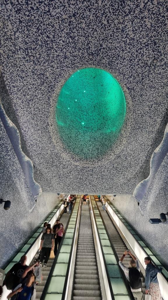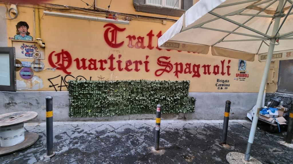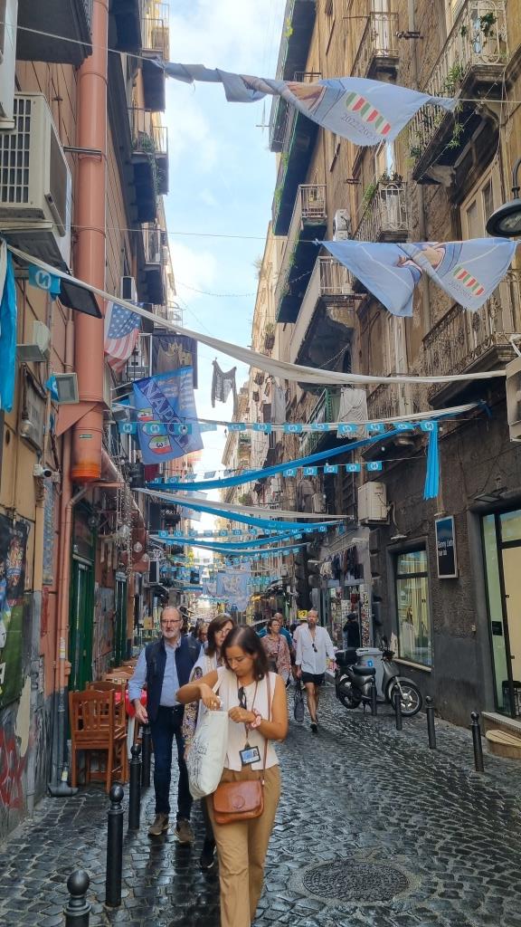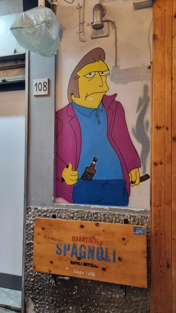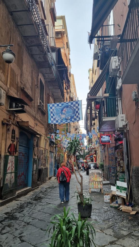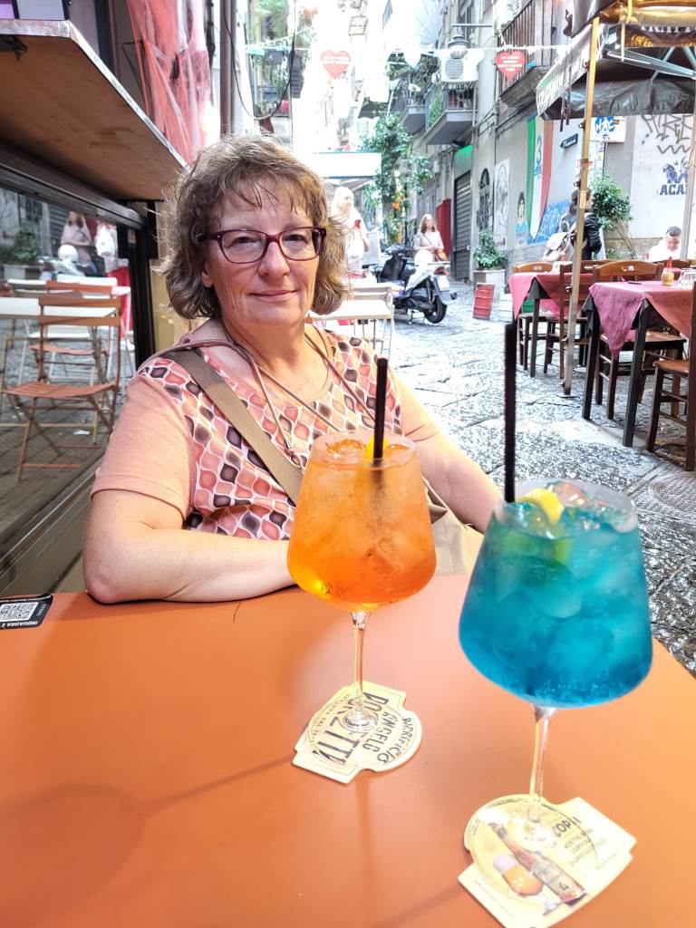 Zum Abschluss laufen wir beim Castel Nuovo vorbei und der Piazza Municipio, also am Rathausplatz vorbei, im Hafen stehen zwei Kreuzfahrtschiffe. Wir schauen noch kurz ins Quartiere Spagnoli hinein. Echt spannend diese Stadt, von monumentalen Palästen, riesigen Plätzen zu engen, schmalen, maroden Gassen und gefühlt hundert Kirchen gibt es hier alles. In einer Bar trinken wir einen Maradonna Spritz, natürlich in blau und begeben uns in die Metrostation Toledo, die für ihre kunstvolle Deckendekoration bekannt ist. Von hier aus fahren wir mit der Metro zur Station Garibaldi und wollen mit dem Zug wieder zurück nach Sorrent.