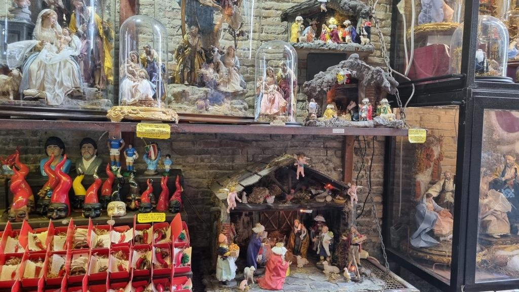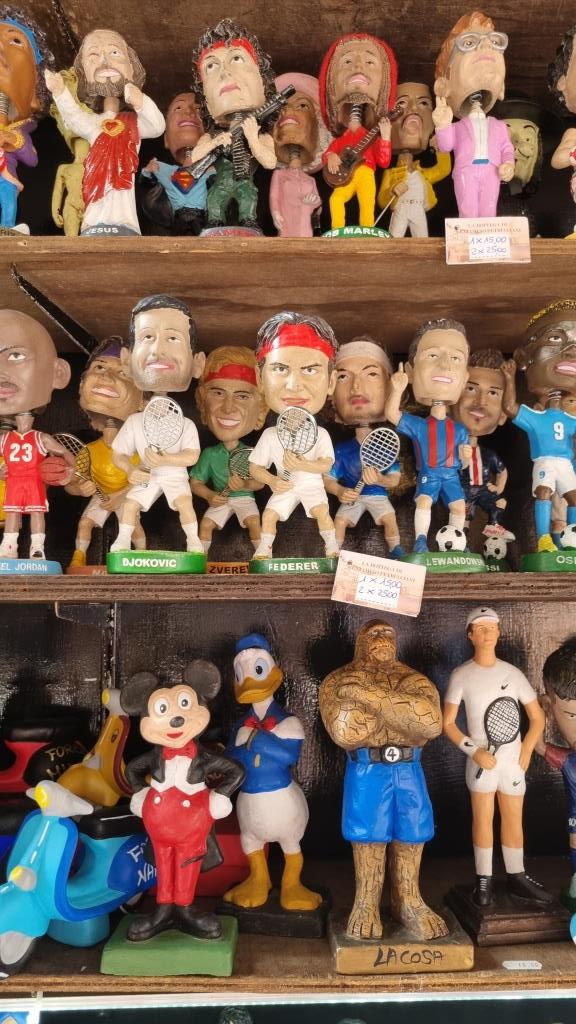 Der Duomo San Gennaro ist riesig mit mehreren integrierten Kirchen und Kapellen. Leider haben wir nicht endlos Zeit und so begeben wir uns weiter auf unserem Rundgang und kommen bei ein paar Kirchen vorbei und der Krippenstrasse. Hier werden Krippenfiguren von unzähligen Stars und Royals und Prominenten verkauft. Etwas bizarr das Ganze, oder wer möchte schon an Weihnachten Donald Duck oder Rambo in der Krippe stehen haben?? Na ja, lustig zum ansehen.
