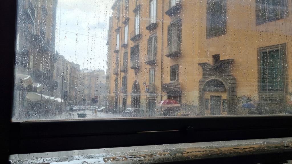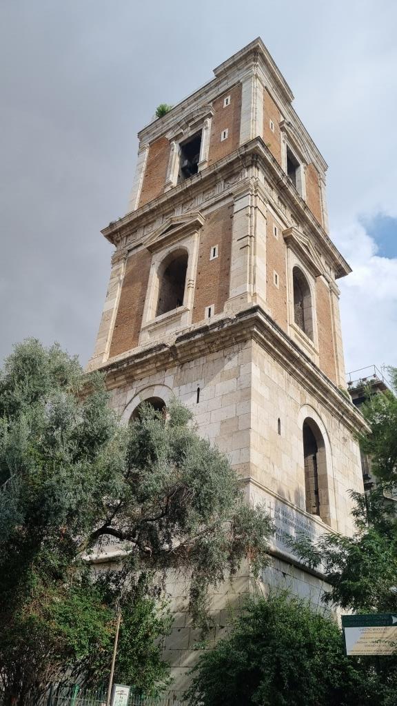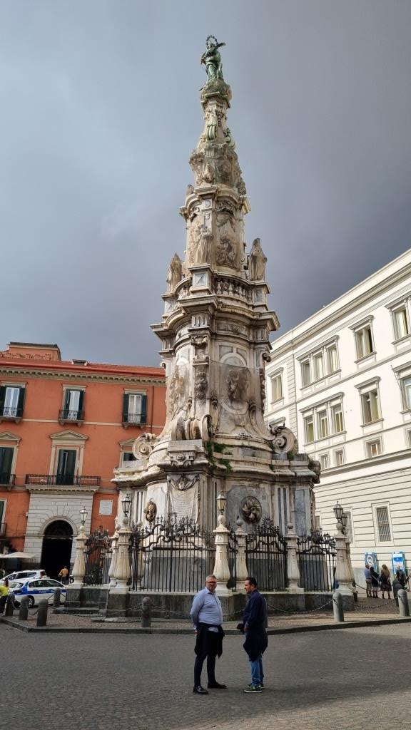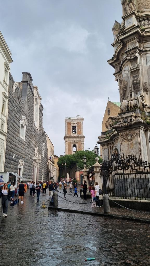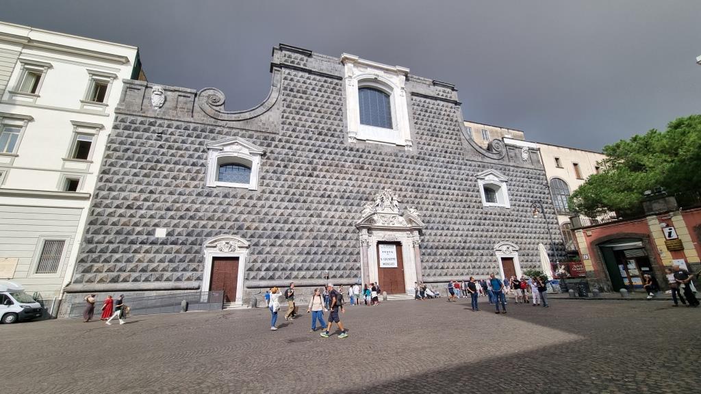 Wir verlassen die Basilika Santa Chiara und stehen vor dem Platz mit der Chiesa Il Gesú Nuovo. Leider ist die Kirche über Mittag geschlossen und so können wir sie nicht besichtigen. Am Himmel sieht es nach Regen aus, also sehen wir zu, dass wir irgendwo in der Nähe einkehren können um etwas Kleines zu essen. Wir finden ein Restaurant, das an der Strasse eine geschützte Terrasse anbietet. Die Lasagne ist gut und günstig und wirklich, kaum sind wir in Sicherheit, kommt ein Platzregen. Er dauert jedoch höchstens eine halbe Stunde und nach dem Essen können wir unsere Sightseeing Tour im Trockenen fortsetzen.