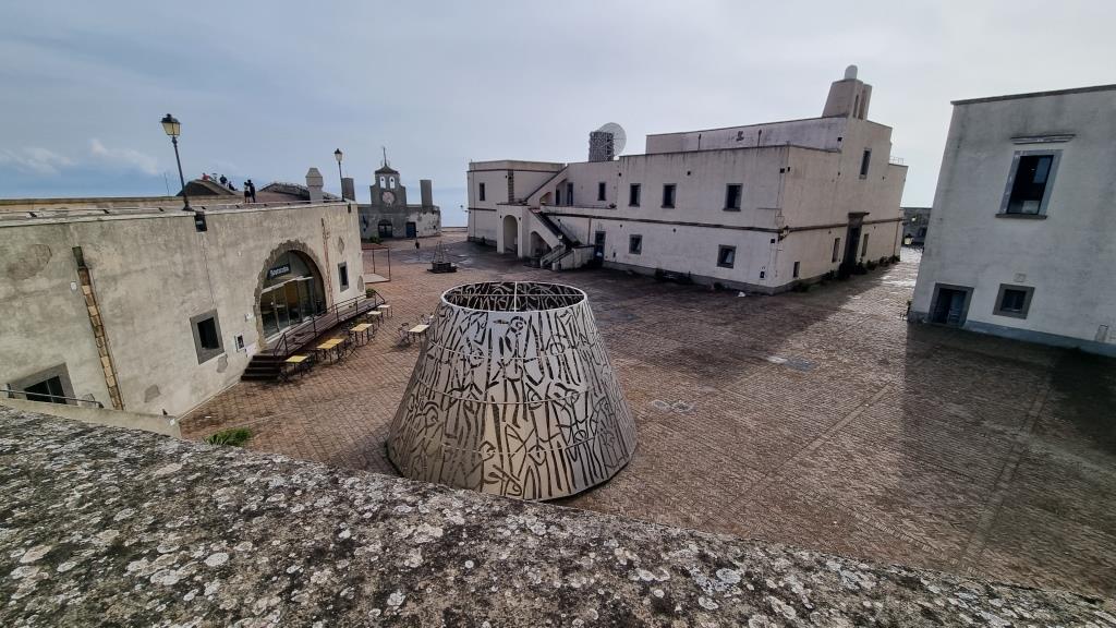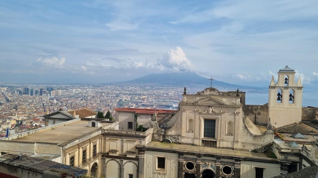 Von hier aus laufen wir weiter zur Funiculare di Montesanto. Mit dieser Standseilbahn fahren wir hinauf zum Castel Sant’Elmo auf dem Hügel Vomero. Wir besichtigen die Festung, d.h. wir spazieren nur oben auf der Festungsmauer von der man rundherum die Aussicht auf Neapel geniessen kann. Das wollte ich unbedingt sehen und auf dem Ausflug mit der Reisegruppe war dies nicht enthalten. Die Aussicht auf Neapel ist wunderschön und von hier oben sieht man auch die Spaccanapoli sehr gut. Es scheint als ob ein Riss durch die Stadt geht.
