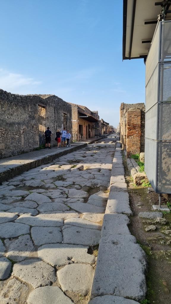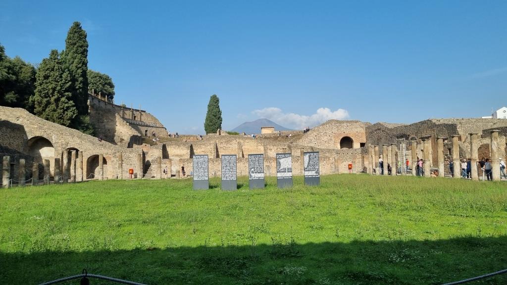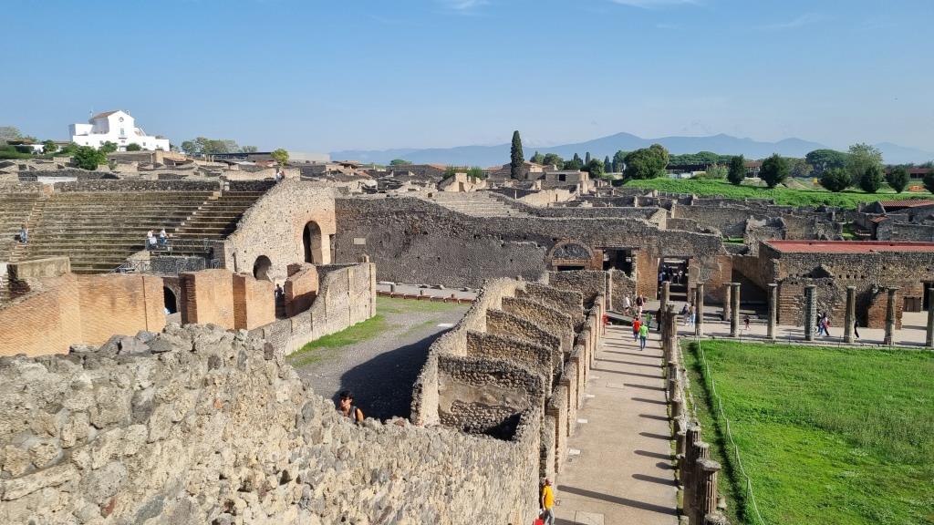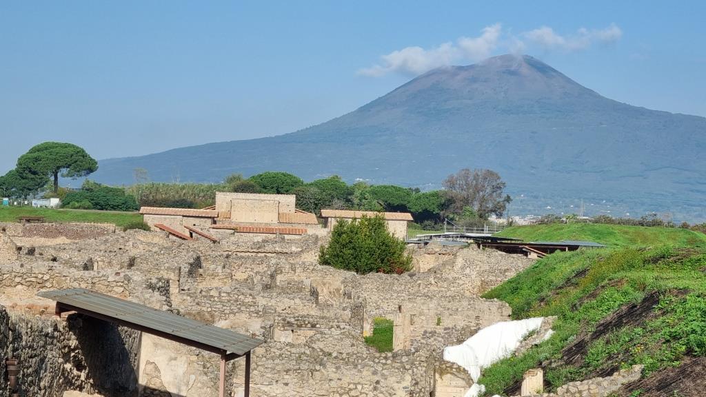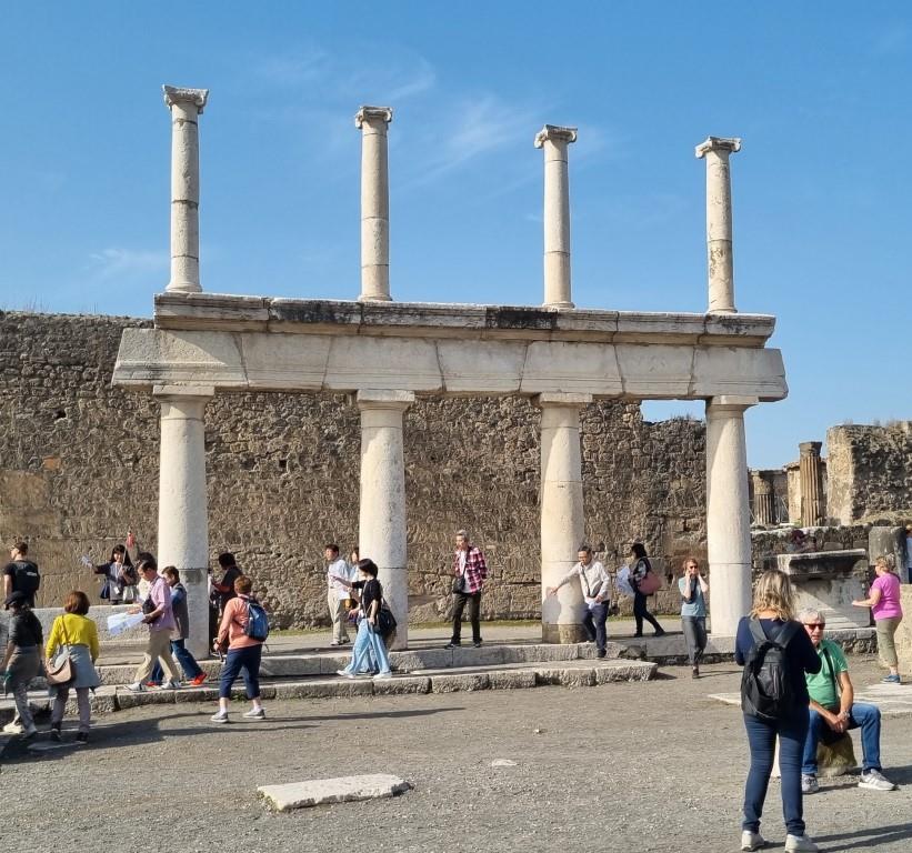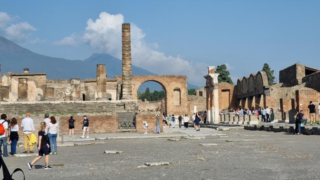 Auf unserer Amalfireise im Oktober 2024 haben wir Sorrent, Ischia, Capri, die Amalfiküste und Neapel besucht. Jetzt fehlt noch die Ausgrabungsstätte Pompeji und der Vesuv. Heute schliessen wir uns wieder unserer Reisegruppe an, da dieser Ausflug im Arrangement inbegriffen ist. Nach dem Frühstück holt uns unsere Reiseleiterin Josephine ab, die übrigens einen Superjob macht. Sie hat immer alles im Griff, organisiert alles perfekt und ist sehr sympatisch und witzig, ausserdem spricht sie sehr gut deutsch. Also sie holt uns ab und wir fahren mit dem Bus nach Pompeji. Heute liegen 4 Kreuzfahrtschiffe im Hafen von Neapel und es werden viele Menschen in Pompeji erwartet. Deshalb nehmen wir einen anderen Eingang und sind am Anfang noch fast alleine unterwegs. Gut gemacht Josephine.