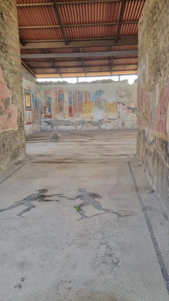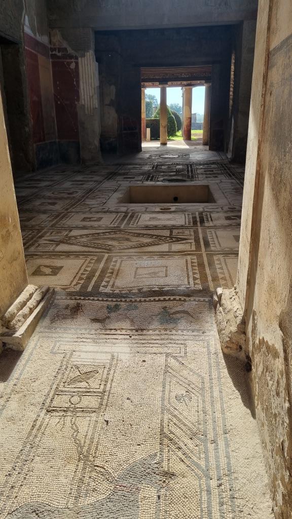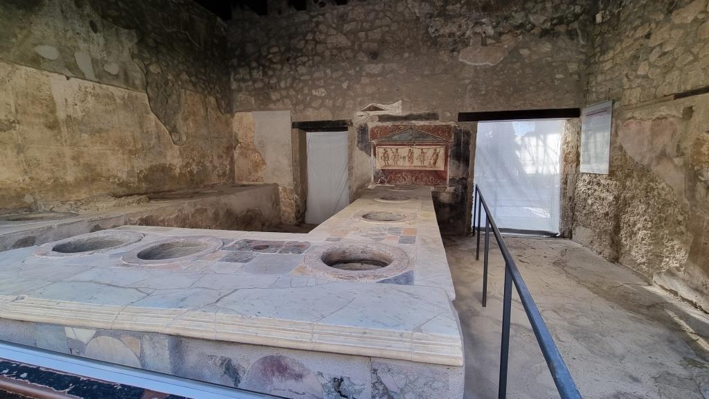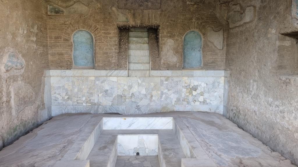 Wir kommen zuerst bei einem grossen Amphitheater vorbei und dann weiter an verschiedenen Häusern und Handwerksbetrieben. Einiges ist gut erhalten, zum Beispiel die wunderschönen Mosaikböden oder die Theken wo Essen verkauft wurde und eine Villa mit Marmorbäder. Wir werfen auch einen Blick ins Freudenhaus hinein.