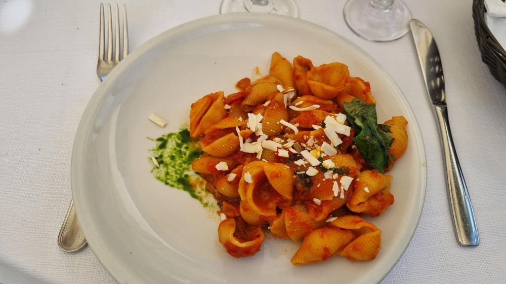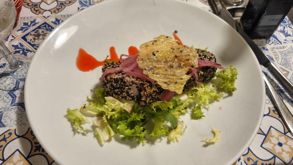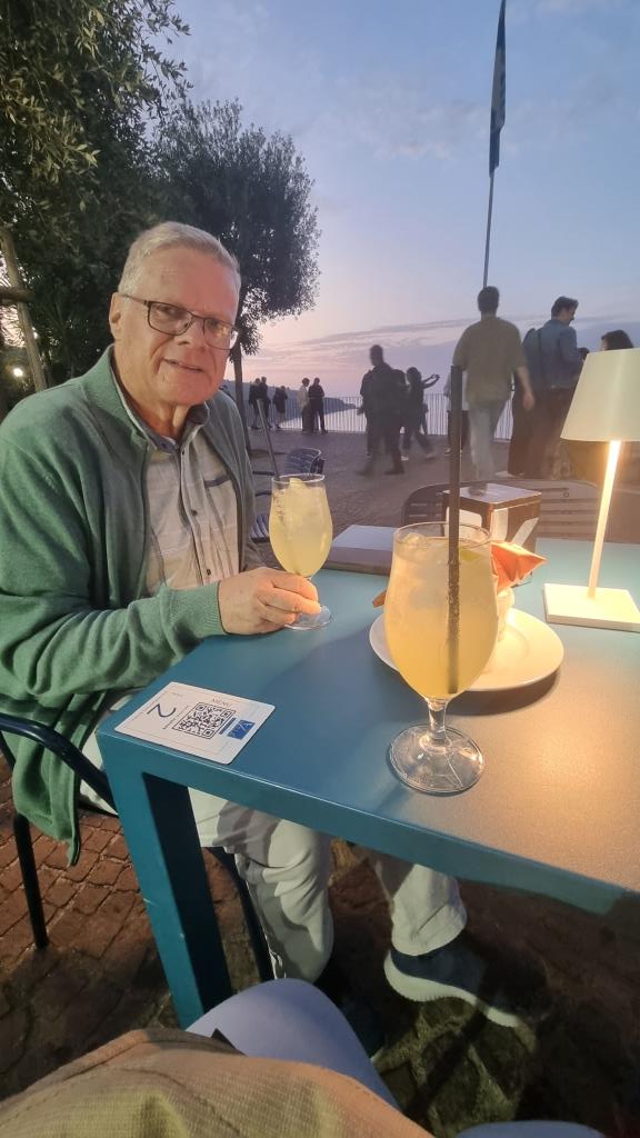 Nach einer kurzen Pause im Hotel fahren wir mit dem Shuttle ein letztes Mal in die Stadt. Ein letzter Limoncello Spritz auf der Aussichtsterrasse und dann suchen wir uns heute ein ganz tolles Restaurant in einer ruhigen Gasse aus. Wir speisen wieder hervorragend und bereuen es überhaupt nicht, dass wir nicht mehr im Hotel gegessen haben. Unsere Mitreisenden beklagen jeden Morgen beim Frühstück, dass das Essen am Vorabend nicht so toll war, aber trotzdem essen sie jeden Abend dort. Wir haben heute ein Rindscarpaccio zur Vorspeise geteilt, ich hatte ein Tunasteak zur Hauptspeise und Andi Fischfilet mit Zitrone und zum Dessert Tiramisu und ein Zitronendessert. Alles köstlich.