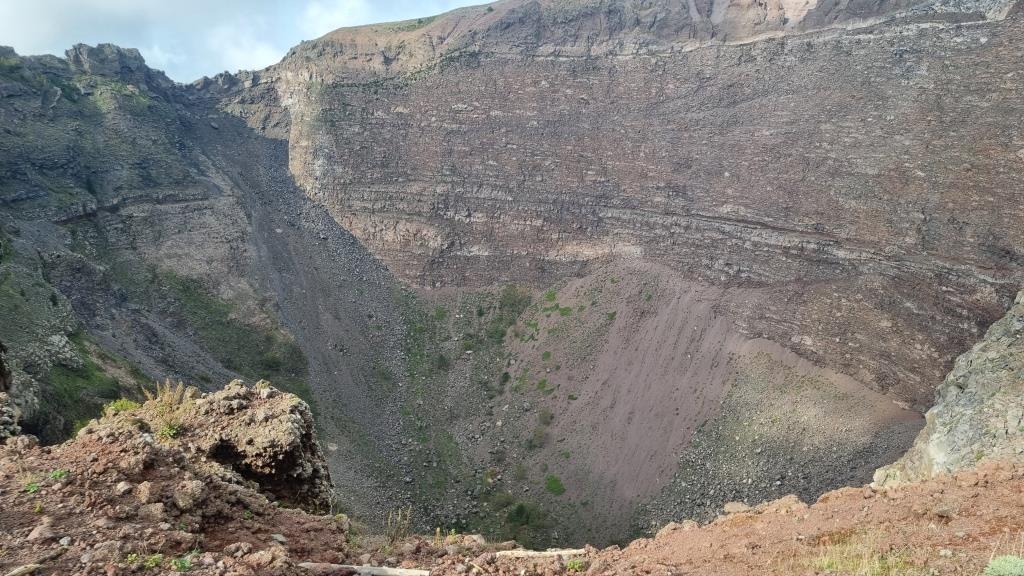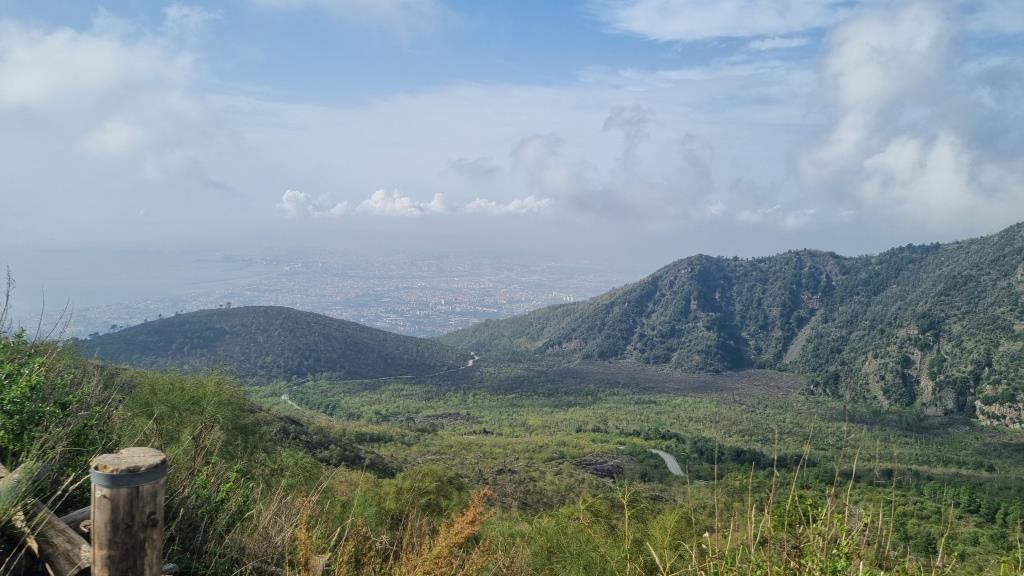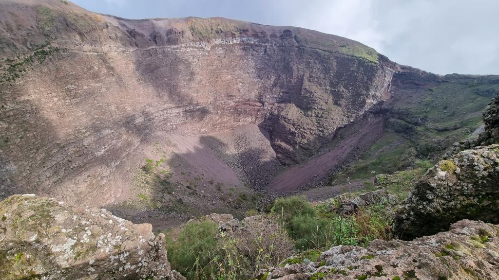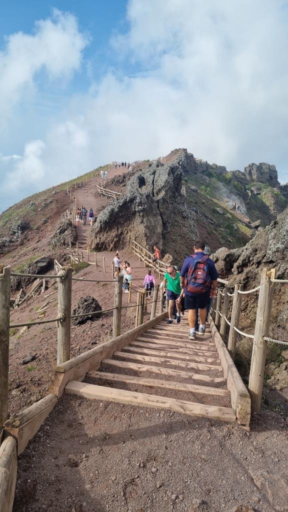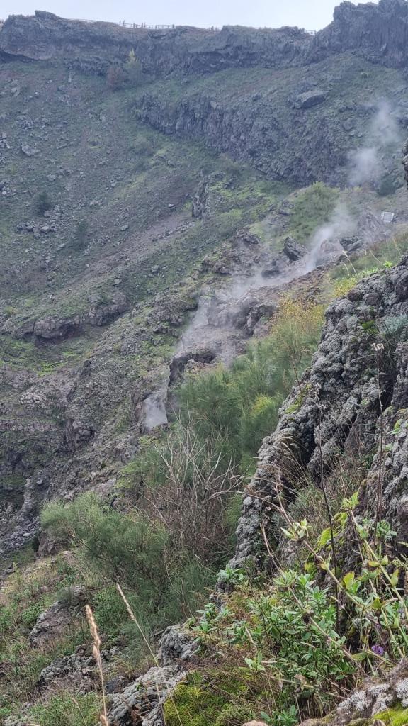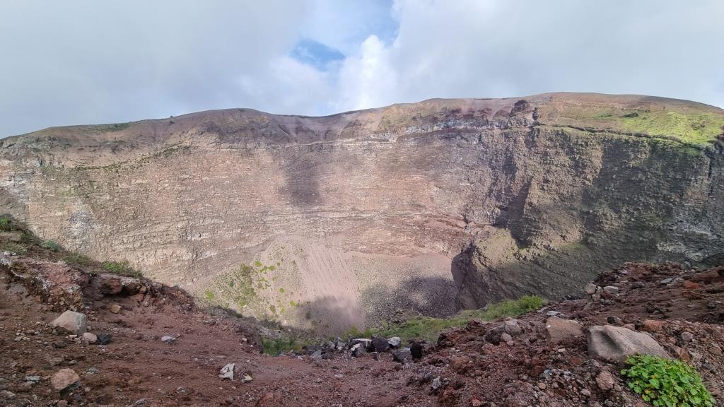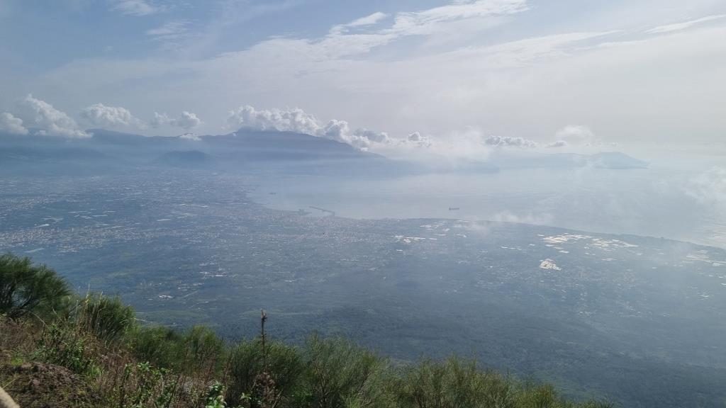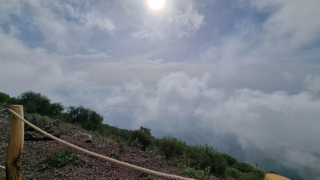 Das Gefühl auf einem noch aktiven Vulkan zu stehen ist schon speziell. Im Vorfeld hatte ich sogar Bedenken, ob ich da wirklich hinauf will. Was, wenn der plötzlich ausbricht. Aber zum Glück ist er ruhig und es ist nur an einer Stelle ein wenig Dampf ausgetreten. Die Aussicht von oben ist leider aufgrund von Wolken und Dunst nicht so toll aber man kann es sich vorstellen wie es bei klarem Wetter aussieht. Wir haben nicht so viel Zeit um alles in Ruhe anzusehen, denn wir müssen schon wieder hinunter und zum Bus. Der Rückweg ist natürlich schneller weil alles abwärts geht. Trotzdem muss man auf dem steinigen Weg aufpassen, dass man nicht rutscht. Gute Schuhe sind da auf jeden Fall angebracht. Wir kommen auf den letzten Drücker zum Bus und schon geht es wieder zurück nach Sorrent.