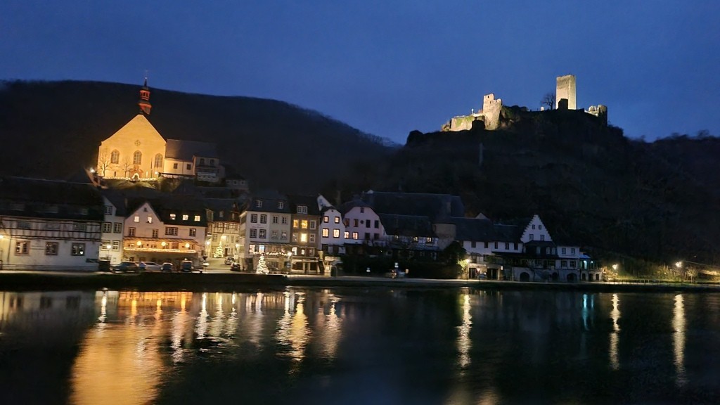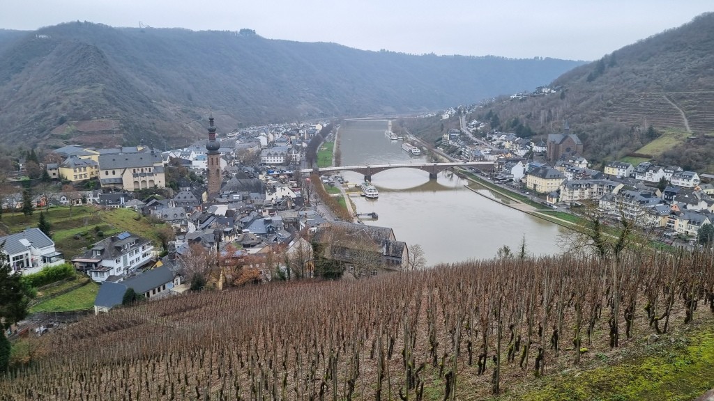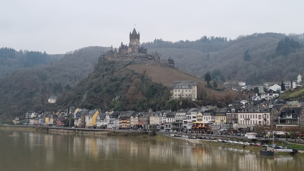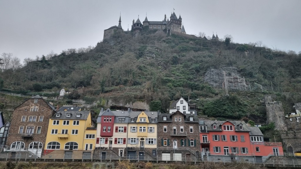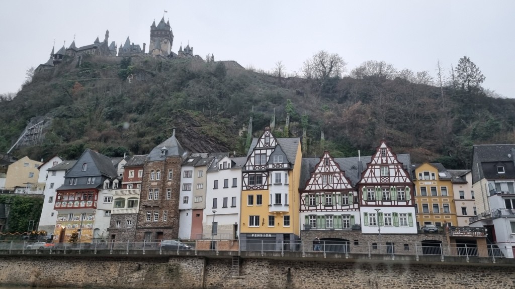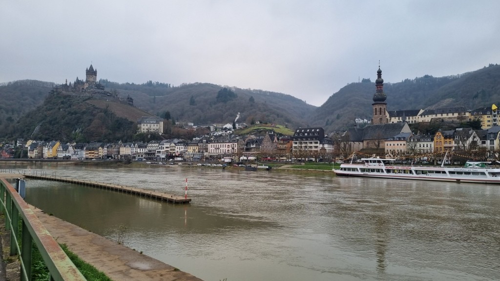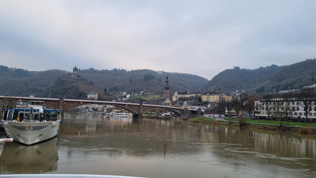 Wir machen es uns in der Kabine bequem vor unserem grossen Fenster, denn um 16:00 Uhr fährt unser Schiff los nach Bernkastel-Kues und wir wollen ja auch noch etwas von der schönen Fahrt sehen bevor es dunkel wird. Die Moselgegend ist bekannt für die Weingüter die sich an den steilen Hängen befinden. Eine schöne Gegend, die bestimmt im Sommer oder Herbst mit den Farben besser zur Geltung kommt als jetzt im Winter.