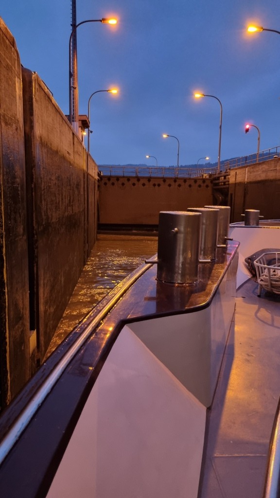 Wir beobachten noch einen Schleusengang aber danach ist es schon dunkel und man sieht nur ab und zu die beleuchteten Städtchen. Wir genehmigen uns heute einen Apéro in der Bar und lassen uns im Anschluss wieder kulinarisch verwöhnen.
