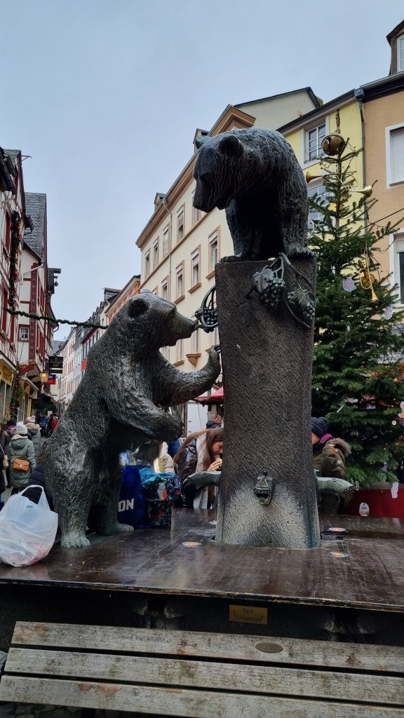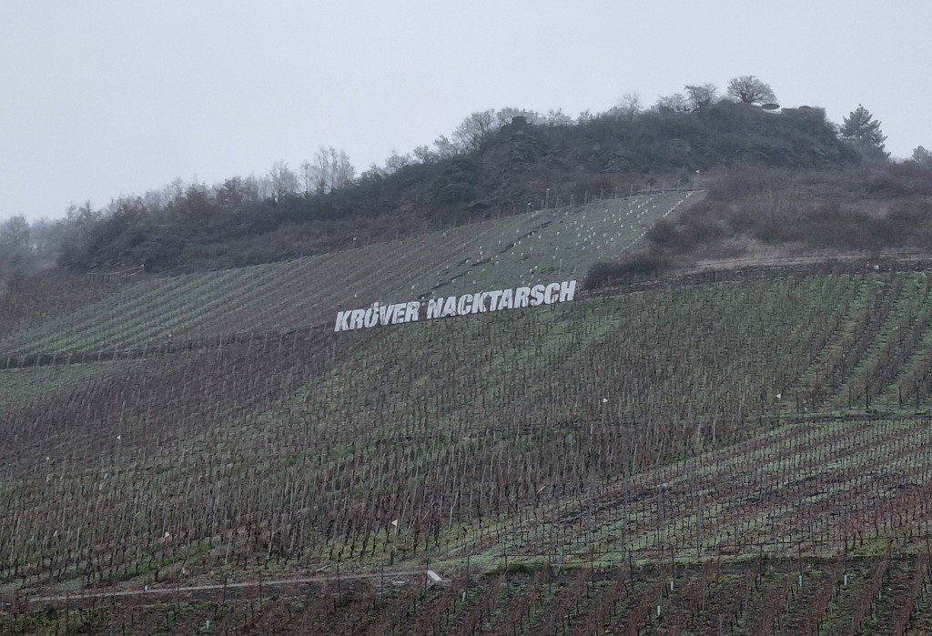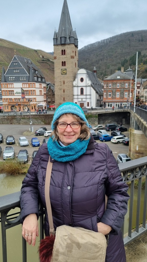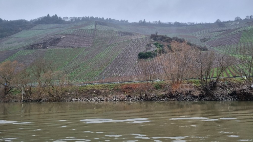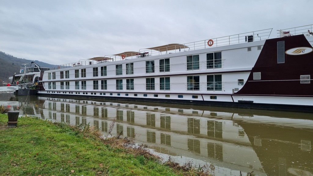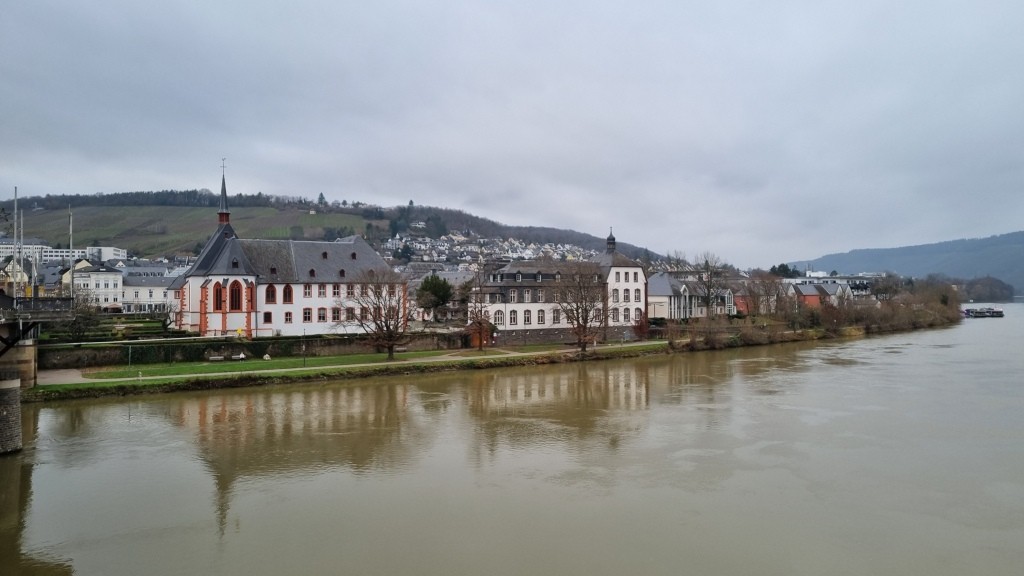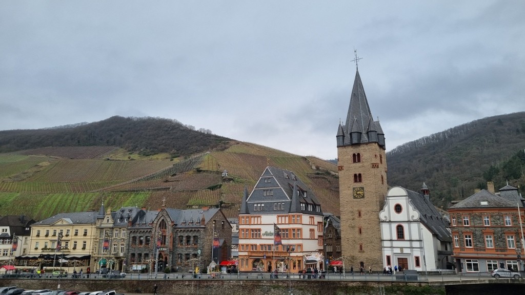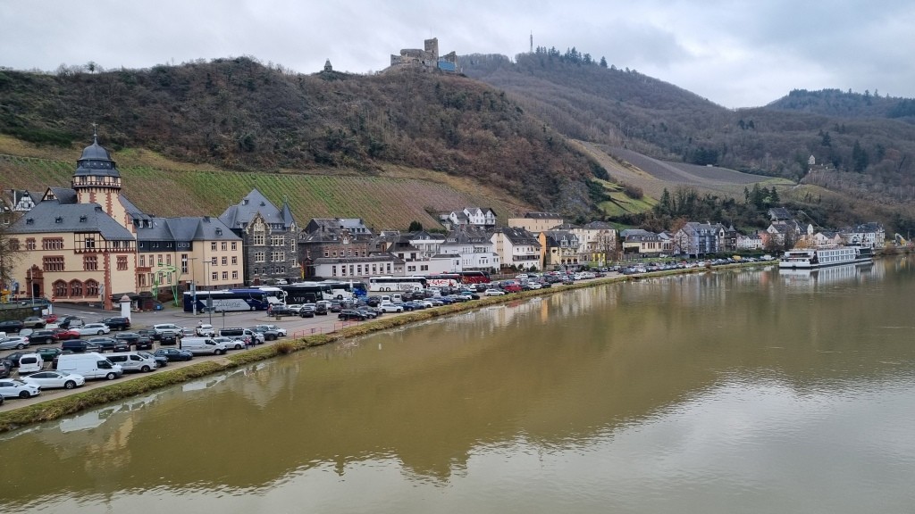 Nach dem Rundgang durch das hübsche Dorf gehen wir wieder zurück zum Schiff. Am späten Nachmittag fährt das Schiff weiter Richtung Trier. Wir können noch ein wenig die extrem steilen Weinberge bewundern. Leider nur noch kahle Rebstöcke und alles in grau wegen Hochnebel. Im Sommer muss es richtig schön sein hier an der Mosel. Leider wird es im Winter so schnell dunkel und man sieht nichts mehr von der schönen Landschaft. Wir gehen in die Lounge zum Abschiedsapéro und danach gibt es wieder ein köstliches Abendessen. Leider wird an unserem Tisch vergessen das Dessert zu bringen. Wir sind mit den Tischnachbarn so im Gespräch vertieft, dass wir uns anscheinend zu spät melden. Da die Küche schon geschlossen ist, erhalten wir eine Flasche Wein zum Mitnehmen anstatt des Desserts. Na ja, der Dessert wäre mir lieber gewesen, aber kann halt mal passieren.