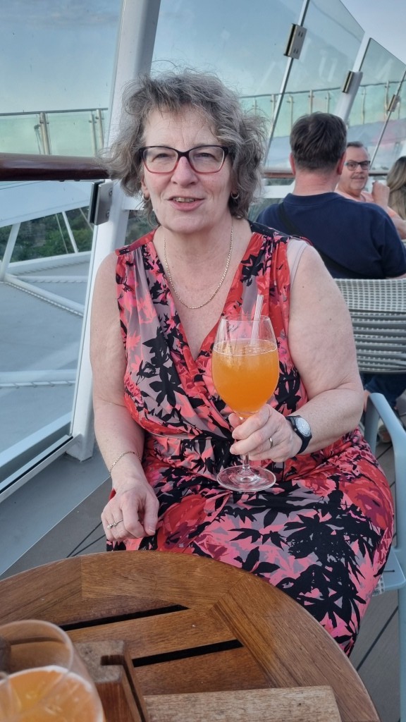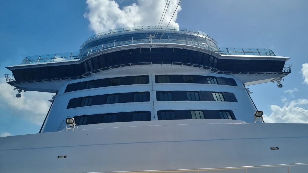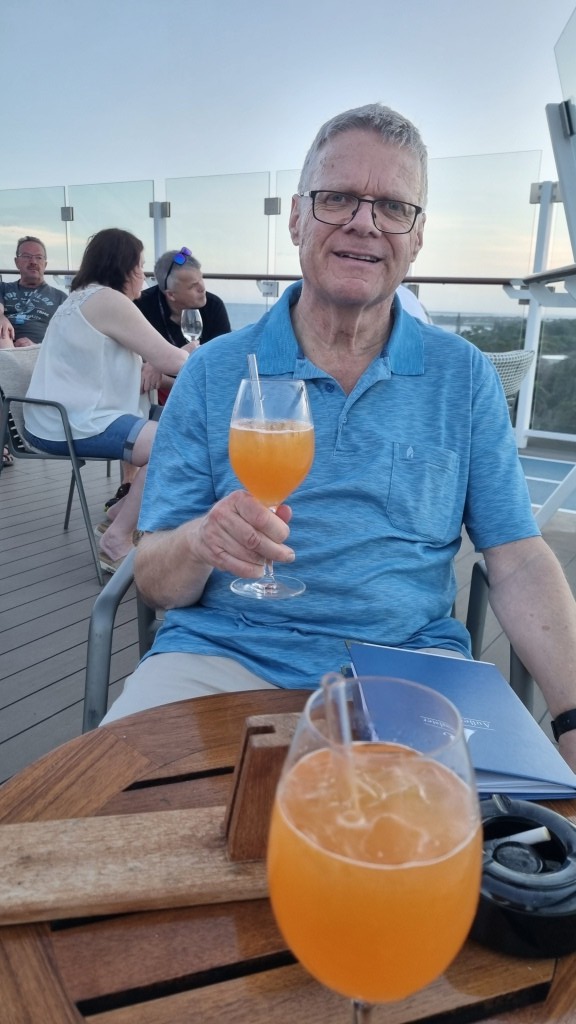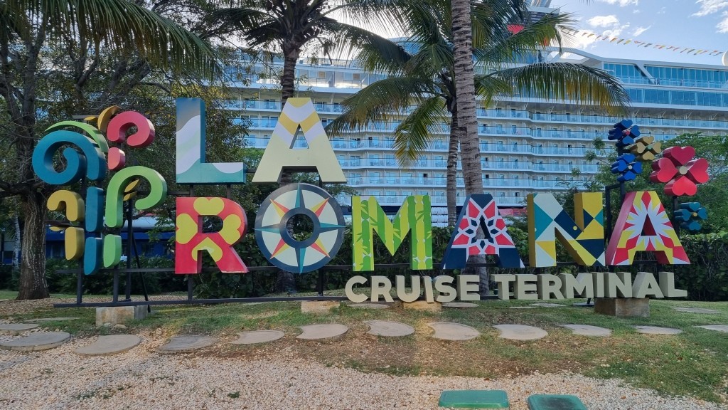 Am Flughafen La Romana wird man von Bussen direkt abgeholt, ohne durch die Immigration zu müssen, und zum Schiff gefahren. Das Gepäck wird ebenfalls direkt zum Schiff gebracht, man braucht nichts herumschleppen und wir müssen es auch nicht vom Gepäckband nehmen. Am Hafen wird kurz eingecheckt, man erhält die Bordkarte und kann aufs Schiff und in die Kabine. Wir haben eine Balkonkabine gebucht auf Deck 9. Das Gepäck ist noch nicht da, aber wir haben Wechselkleidung im Handgepäck. Wir machen und kurz frisch und gehen bereits um 18 Uhr in die Aussenalsterbar zum Apéro. Hier geniessen wir den sonnigen Abend und es kommt Ferienfeeling auf.