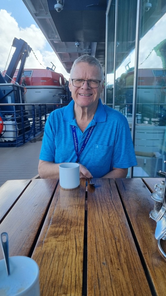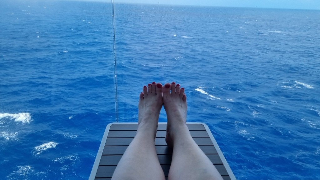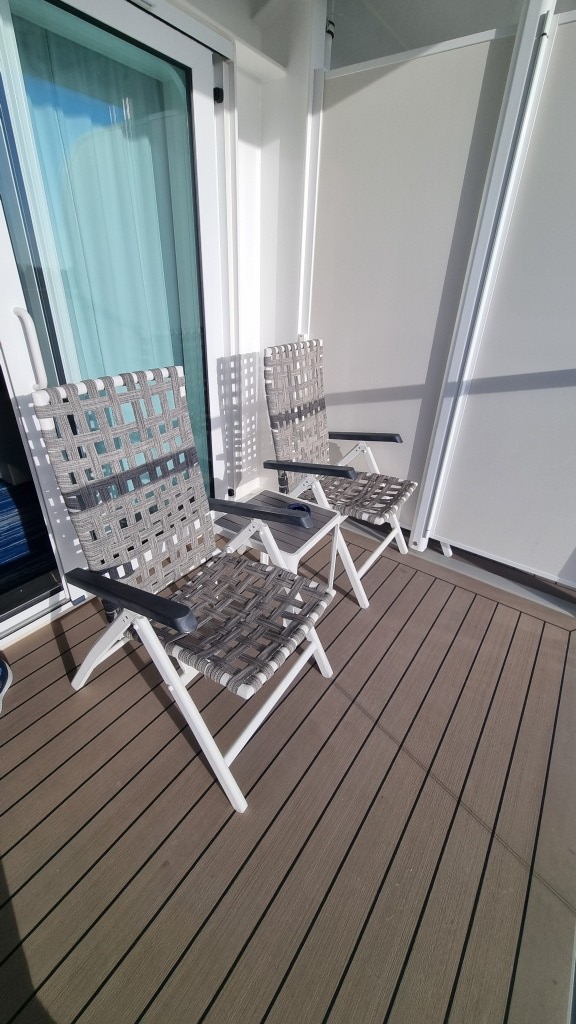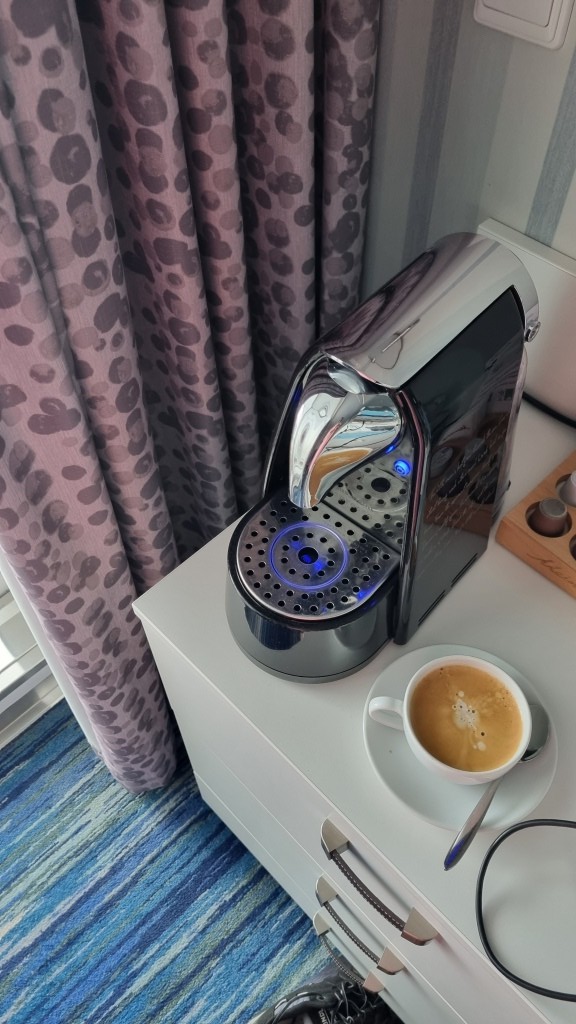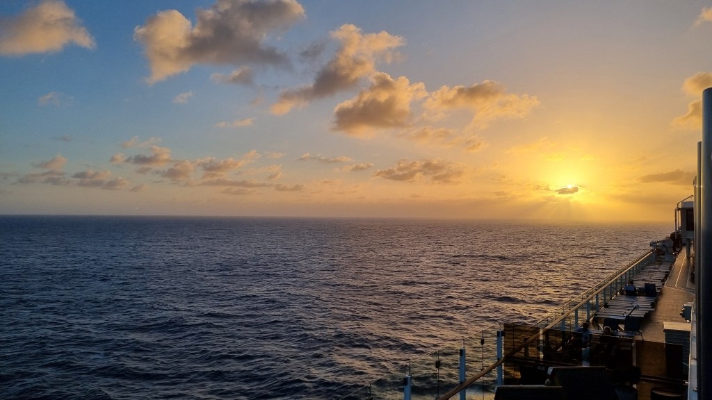 Zum Glück ist der erste Tag ein Seetag. So können wir ausschlafen, den Tag gemütlich angehen mit einem Kaffee aus der in der Kabine befindlichen Kaffeemaschine und diesen auf dem Balkon mit Sicht aufs offene Meer geniessen. Herrlich.