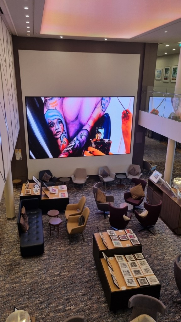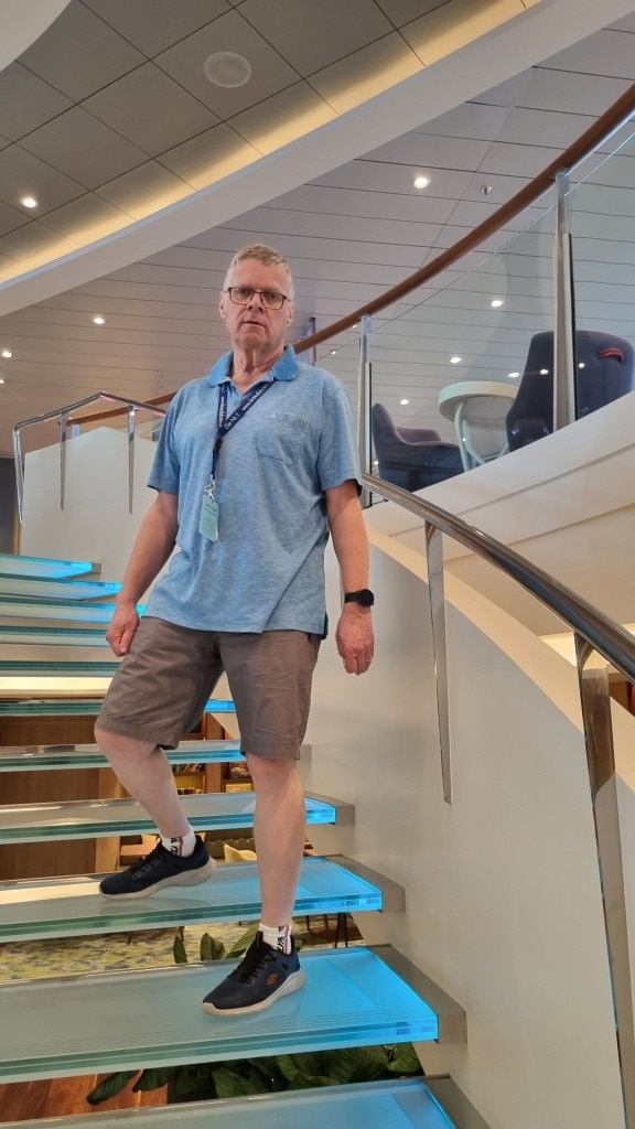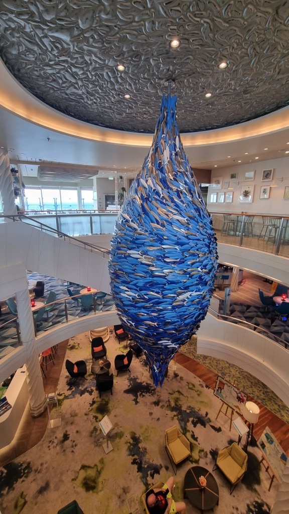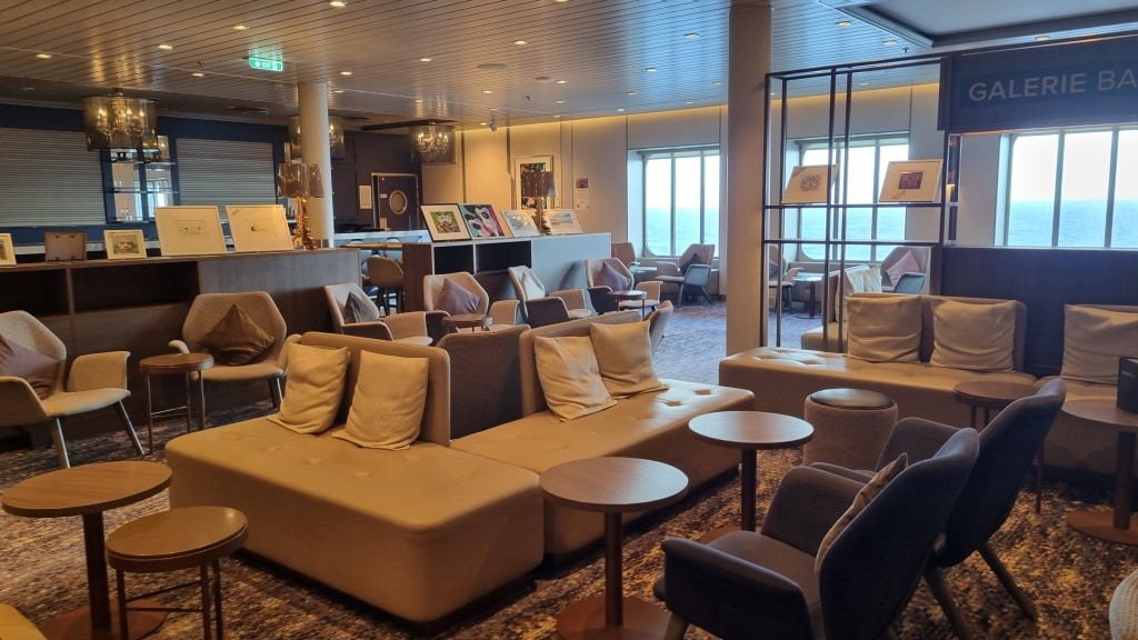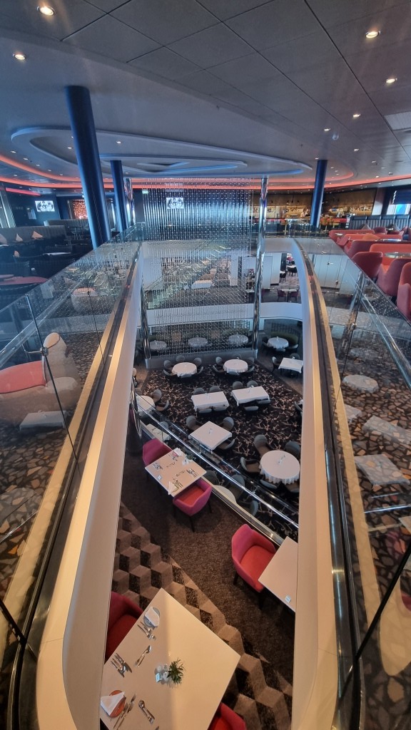 Nach dem Frühstück im Atlantik Restaurant wollen wir erst mal das Schiff erkunden. Wir fangen auf Deck 3 bei der Reception an und arbeiten uns hinauf bis auf Deck 12.