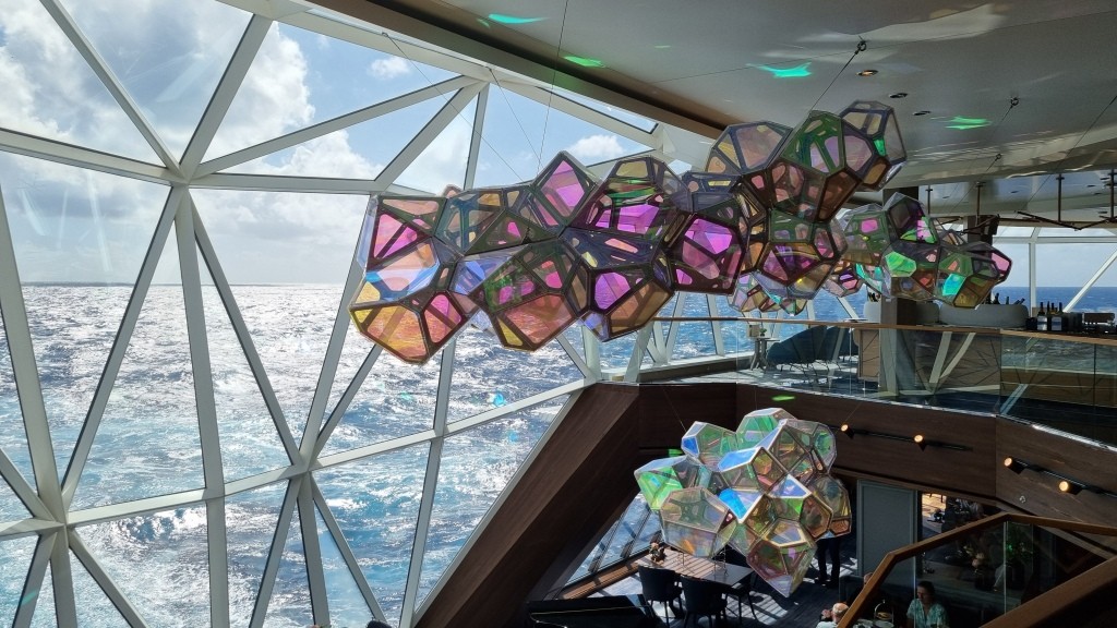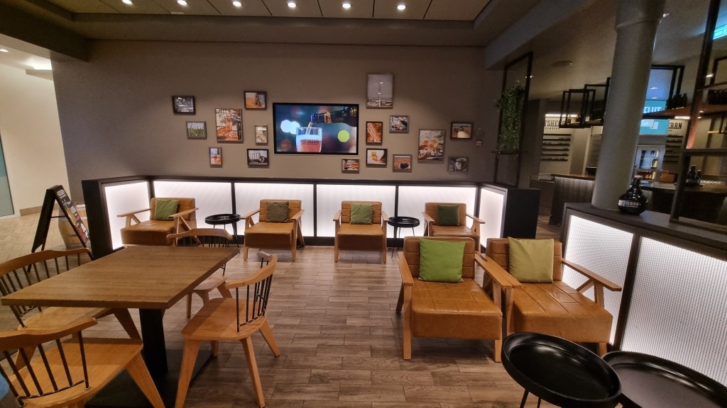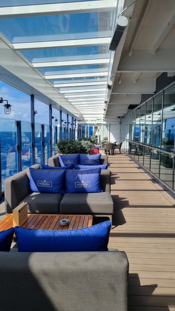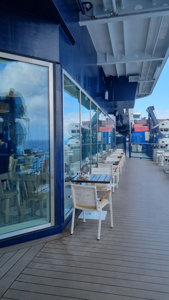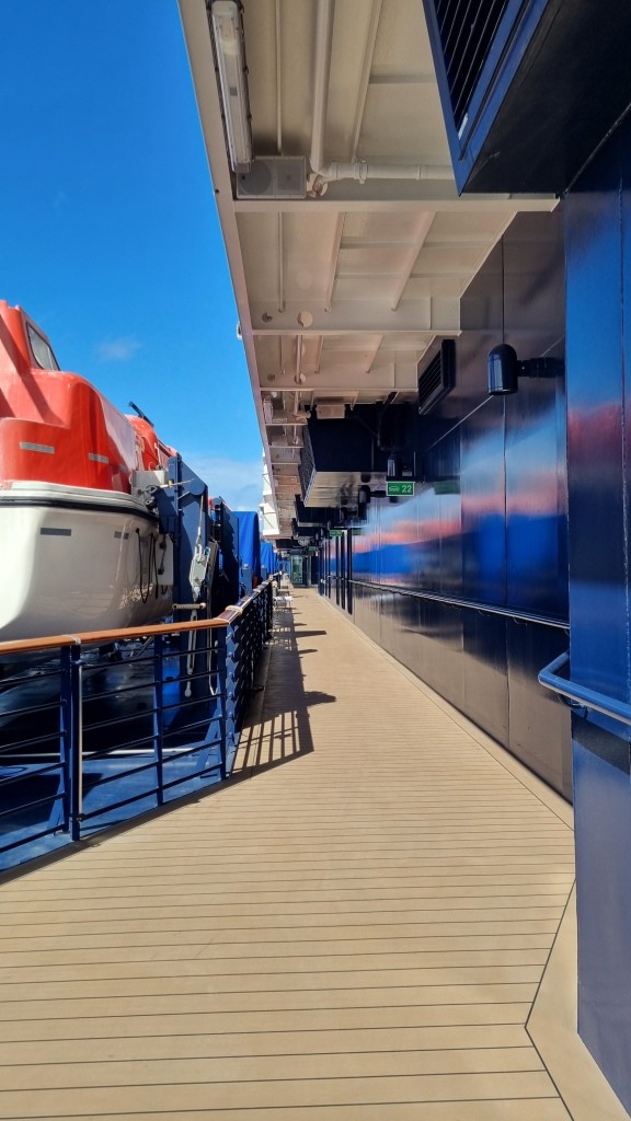 Auf dem Promenadendeck machen wir eine Runde ums Schiff und trinken an den Aussenplätzen des Tag und Nacht Bistros noch einen Kaffee. Dann geht die Erkundung weiter.