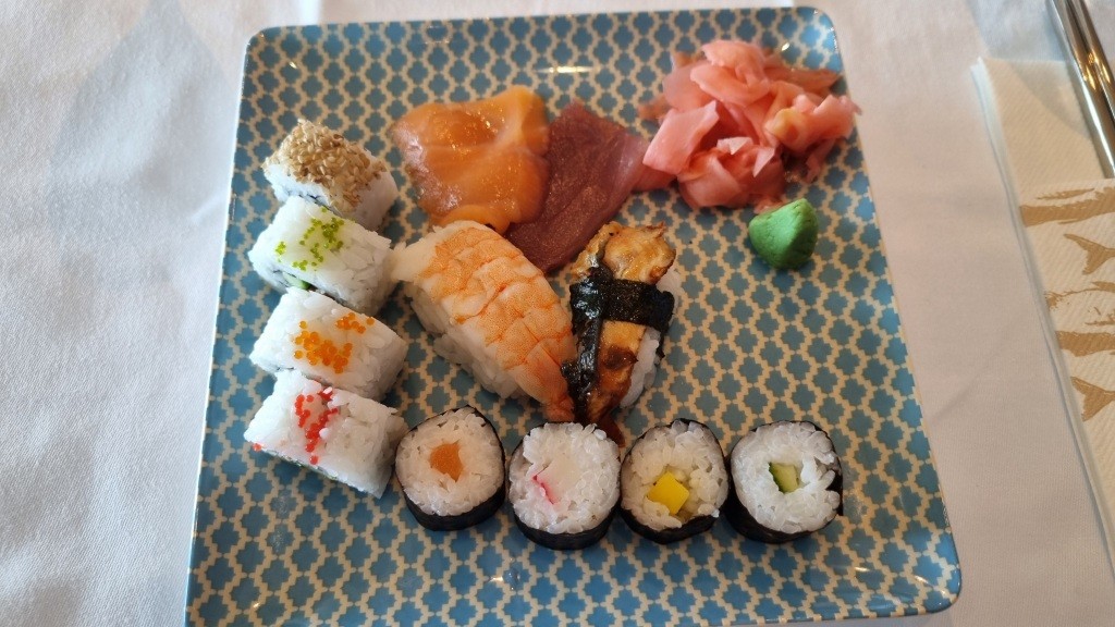 Am Nachmittag drehen wir eine Runde am Sonnendeck und spazieren auf der Jogginstrecke. Am späteren Nachmittag haben wir noch eine Sushi-Verkostung, die sehr lecker ist.