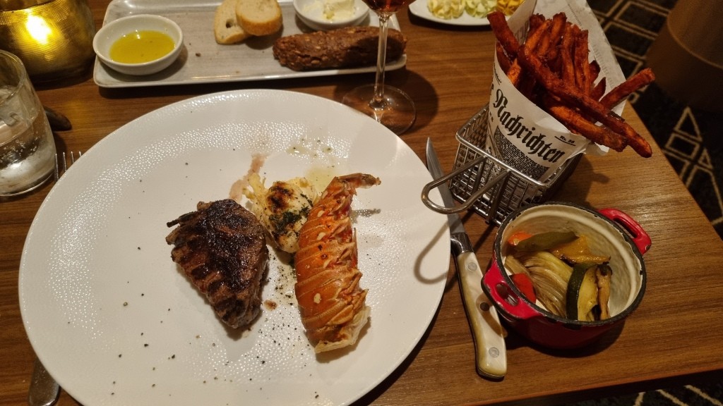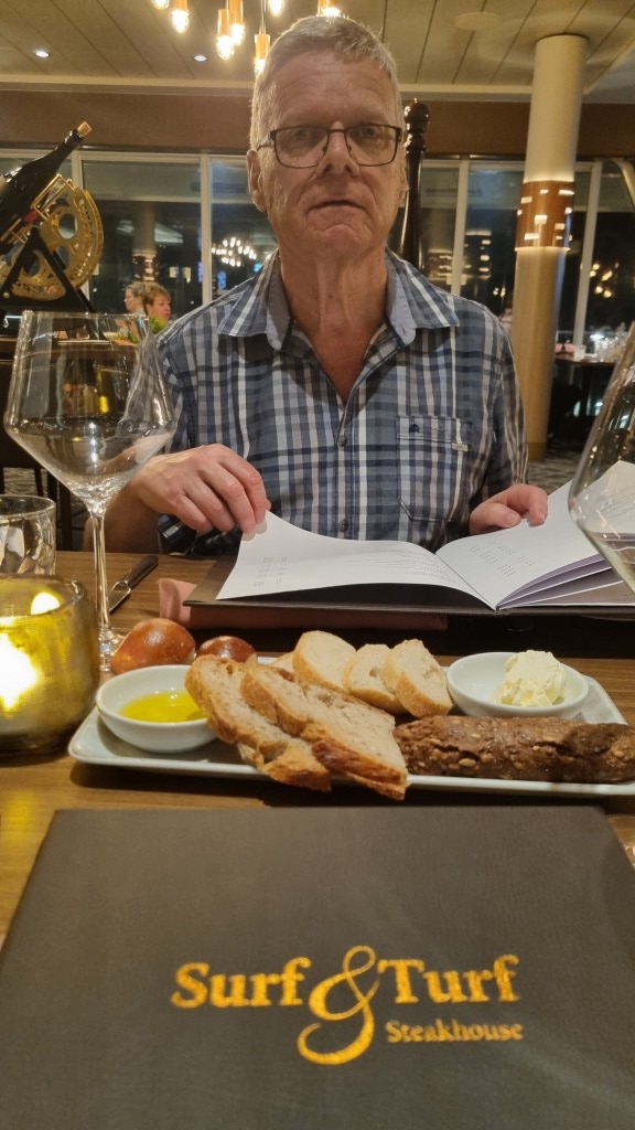 Für heute haben wir einen Tisch im Steakhouse Surf & Turf reserviert. Hier muss man etwas draufzahlen, hat aber eine andere Karte und erlesene Fleisch- rsp. auch Hummerstücke. Wir sind zwar fast verfroren im runtergekühlten Steakhouse, das Essen war aber sehr gut.