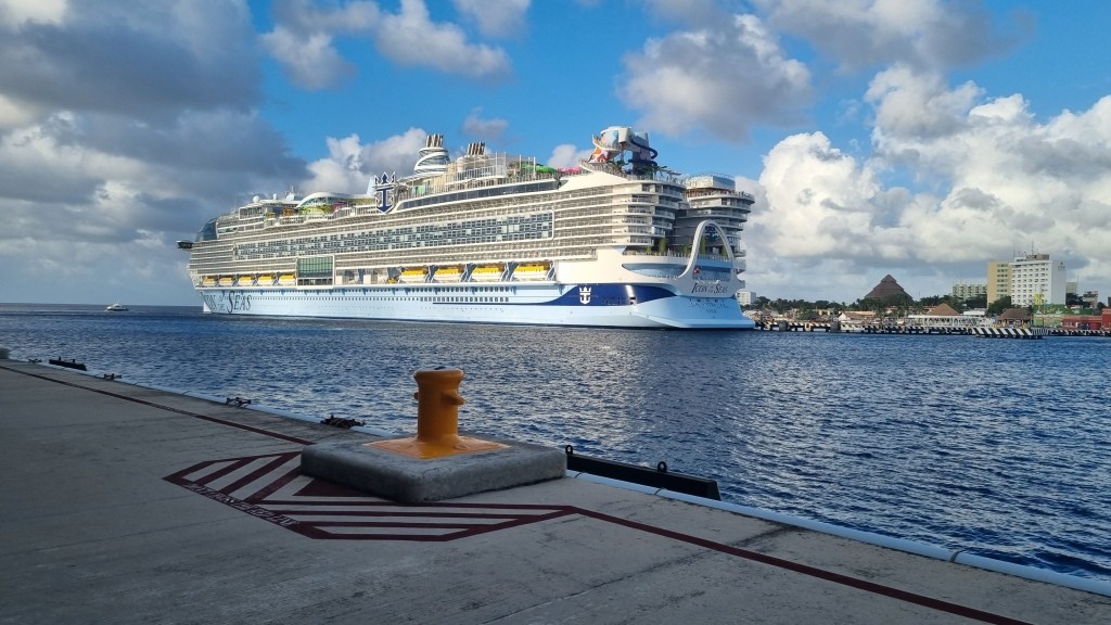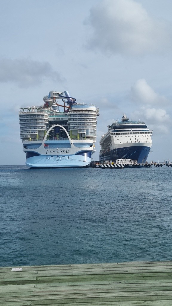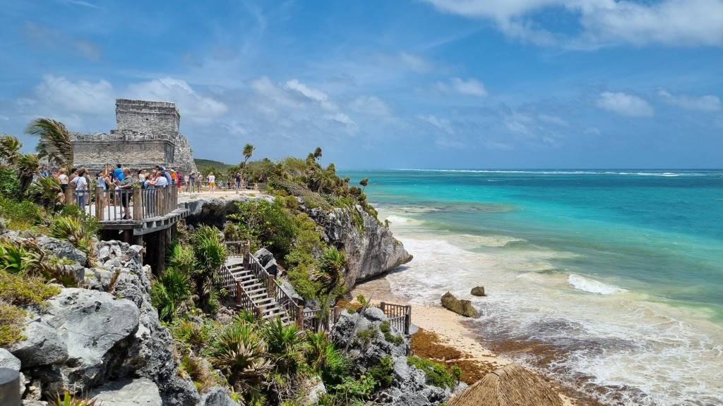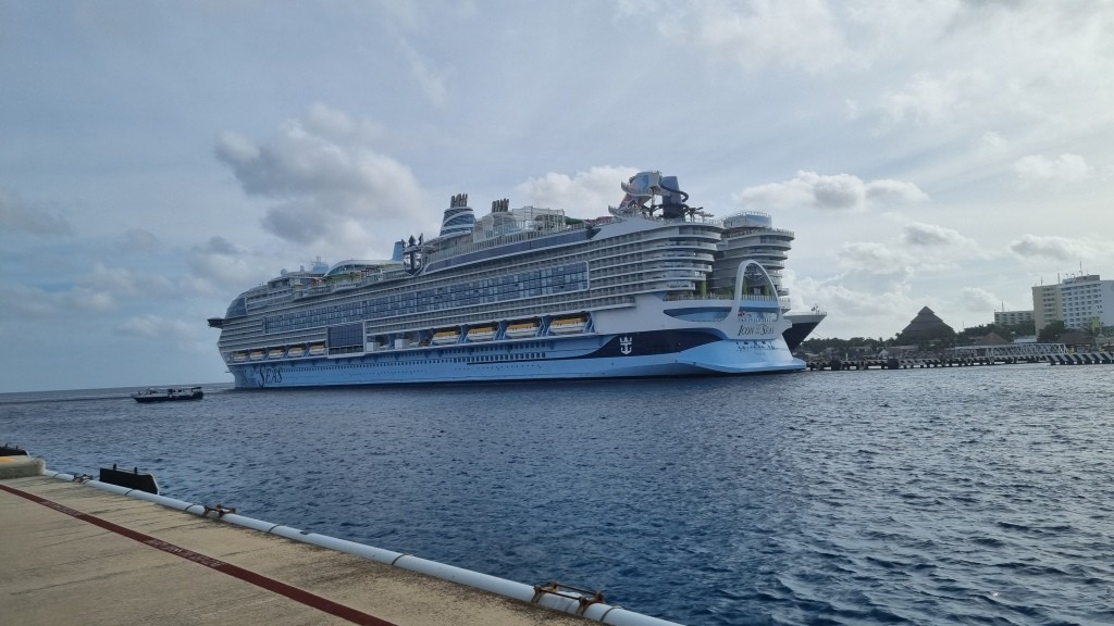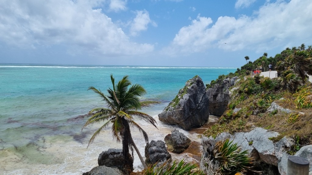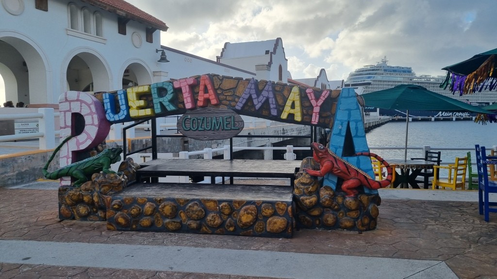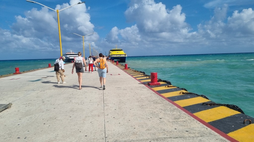 Wir haben Glück und können unseren Ausflug nach Tulum antreten. Wir haben hier wieder den Ausflug bei Tui Cruises gebucht. Nach dem Frühstück geht es los. Am Hafen staunen wir über die vielen Kreuzfahrtschiffe die hier parkieren. Besonders die Icon of the Seas fällt auf, das zur Zeit grösste Schiff mit ca. 7800 Passagieren. Kein Wunder haben sie keine Kapazitäten mehr bei so Riesenpötte. Wir fahren zuerst mit einer Fähre aufs Festland Mexico. Die Überfahrt dauert etwa 1 Stunde. Das Boot schaukelt ganz schön, das Meer ist sehr bewegt, das merken wir vor allem als das Boot vor dem Hafen Playa del Carmen stoppt und auf die freie Anlegestelle warten muss. Dann geht es endlich weiter und wir legen in Playa del Carmen an und können die Fähre verlassen. Wir werden zu unserem Bus geleitet und dort wartet auch schon der etwas spezielle Reiseleiter. Ein richtiger Lebenskünstler Typ, zu allem Elend noch Schweizer. Mit dem Bus fahren wir ca. 1 Stunde nach Tulum.