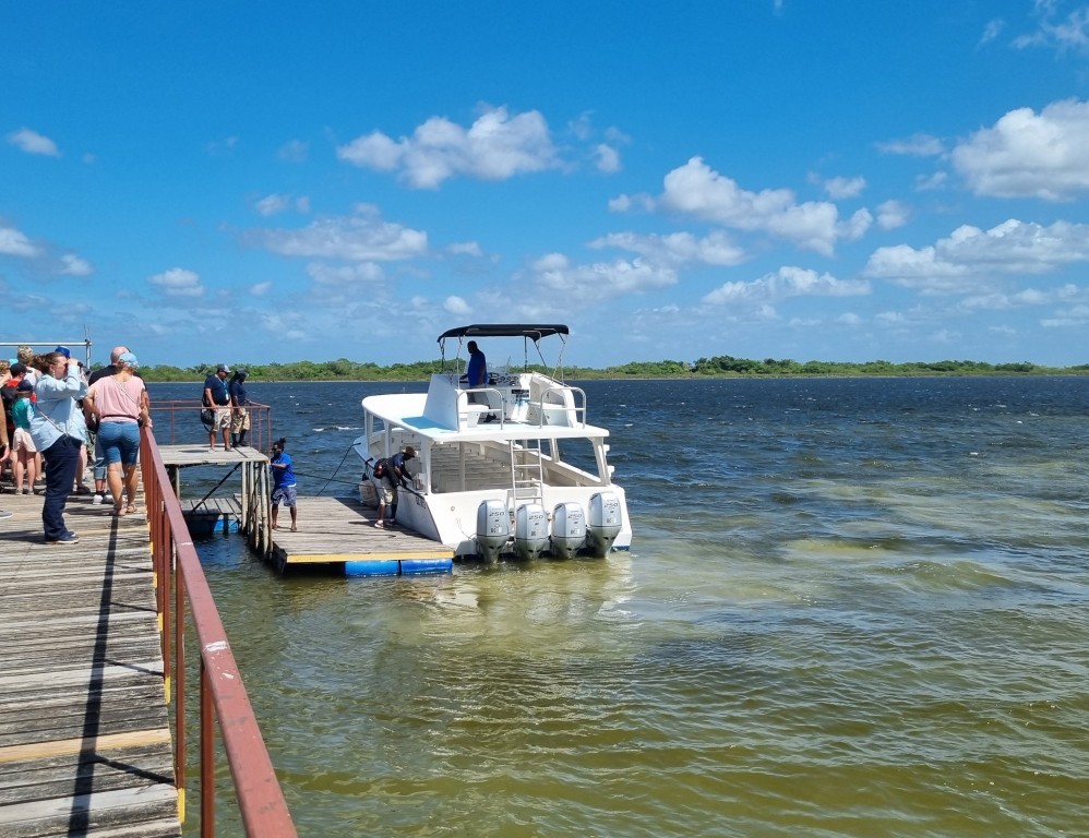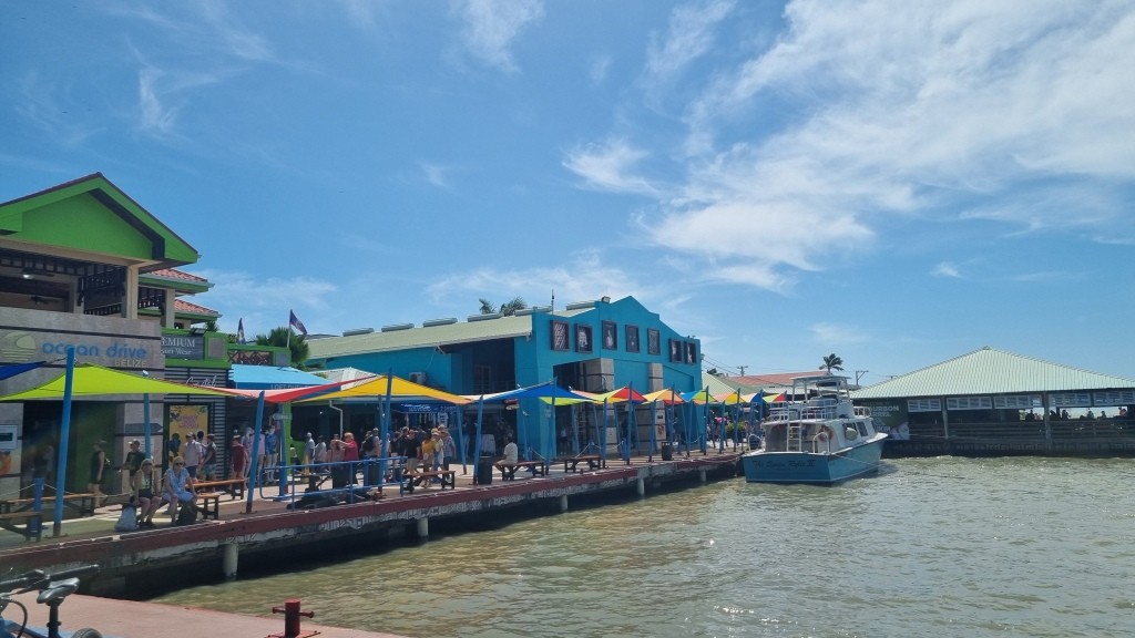 Wir kommen am Morgen in Belize an. Da vor Belize ein grosses Riff lagert muss die Mein Schiff 1 hier vor Anker gehen und es ist tendern angesagt. Wir haben wieder einen Ausflug mit Tui Cruises gebucht, Kulturelles Lamanai mit Bootsfahrt. Wir sind einen Tag früher als geplant in Belize, aber das hat alles Tui Cruises umgebucht. Mit dem Tenderboot geht es zuerst zum Hafen von Belize City. Das Einsteigen ins Tenderboot gestaltet sich etwas schwierig, da die kleinen Boote ziemlich schaukeln. Jeweils 2 Besatzungsmitglieder hieven jeden Passagier ins Boot. Das klappt ganz gut und die Fahrt dauert ca. 30 Minuten. Am Hafen von Belize werden die einzelnen Gruppen wieder auf die Busse verteilt. Wir fahren mit dem Bus etwa 1 1/2 Stunden ins Landesinnere zu einem Resort am Fluss. Von dort geht die rasante Fahrt mit einem Schnellboot dem Fluss entlang bis zur Anlegestelle Lamanai.