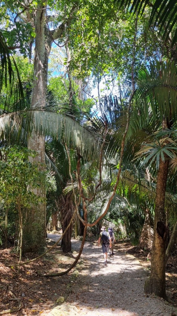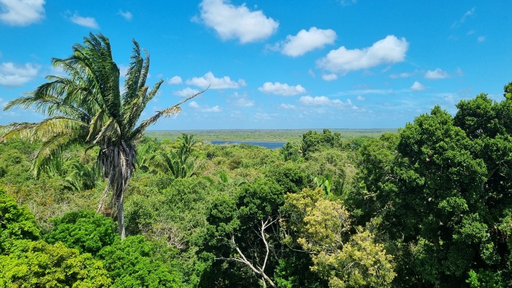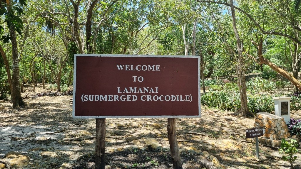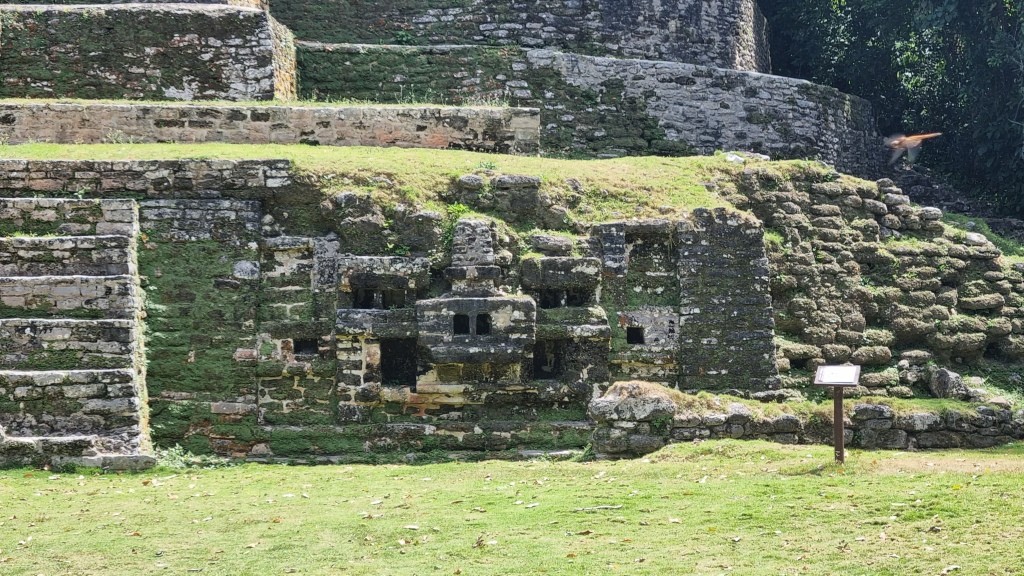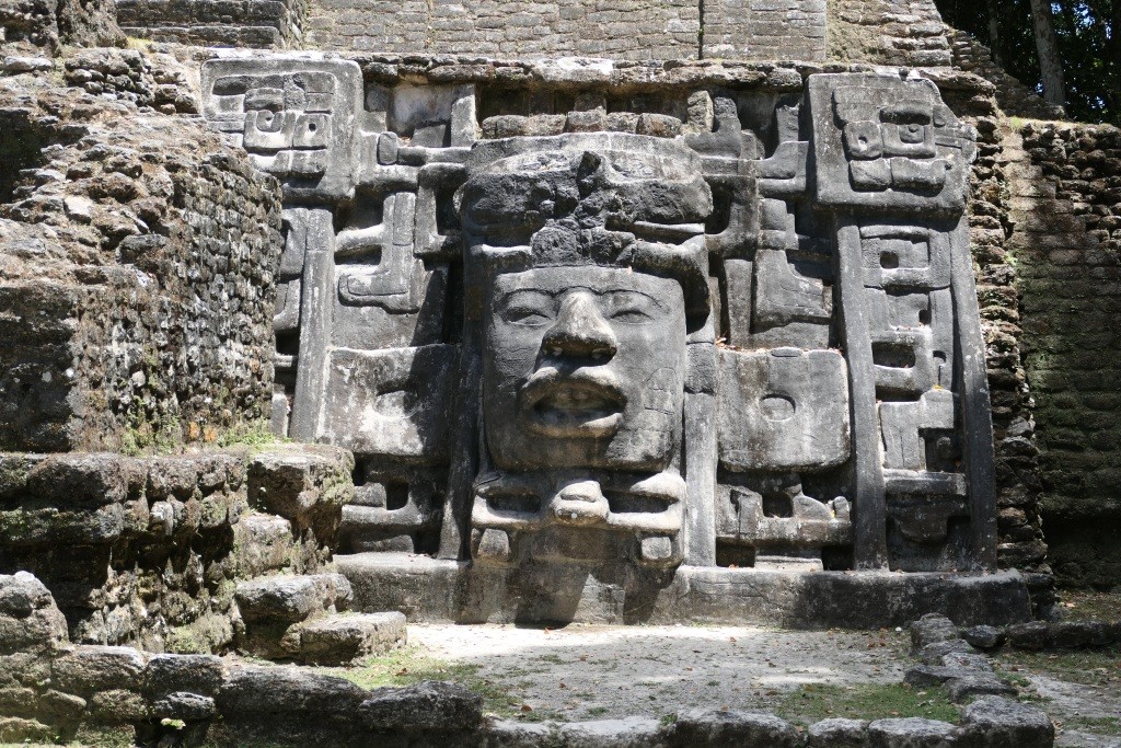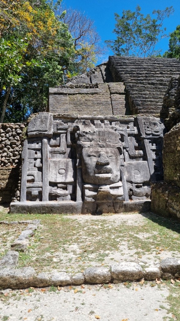 Von der Anlegestelle spaziert man ein Stück durch den dschungelartigen Wald zu der Mayastätte Lamanai. In den Bäumen sehen wir ein paar Brüllaffen. Die Vegetation ist sehr vielfältig und plötzlich steht man vor dem imposanten Maskentempel.