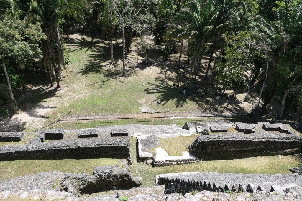 Der Maskentempel ist sehr beeindruckend mit den beiden Steinmasken links und rechts. Wir gehen weiter zum Hohen Tempel. Auch dieser ist sehr eindrücklich und auf der Rückseite ist eine Treppe aufgebaut, sodass man ihn sogar besteigen kann. Von oben hat man einen herrlichen Rundblick in den Dschungel und zum Fluss hinunter. Die Originaltreppe am Tempel ist krass steil. Zum Glück muss man nicht hier hinauf.