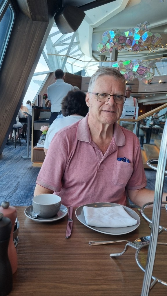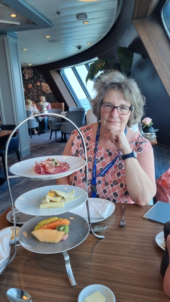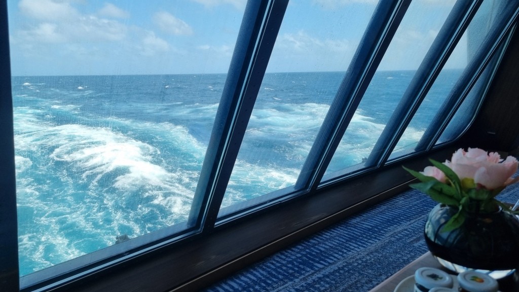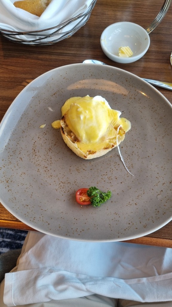 Am heutigen Seetag gönnen wir uns ein Frühstück im Esszimmer. Dieses Bezahlrestaurant befindet sich im Heck des Schiffes im sogenannten Diamanten und bietet eine schöne Aussicht sowie ein bedientes Frühstück mit gewissem Etwas für moderate E 8.50.