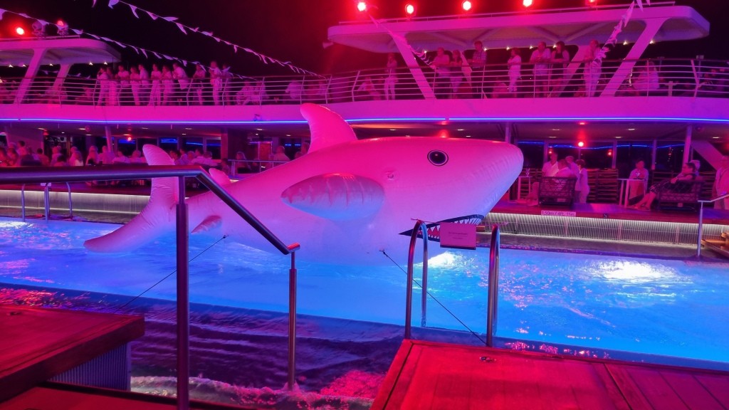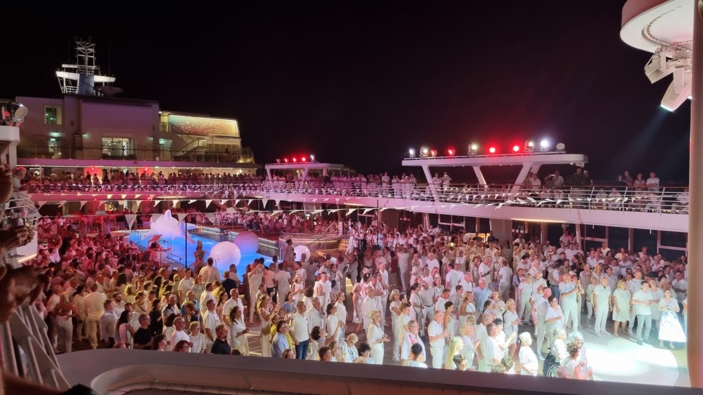 Den Nachmittag verbringen wir mit Spazieren auf dem Schiff, Ausruhen auf unserem Balkon, Apéro und Abendessen. Heute ist auf dem Pooldeck White Night Party. Da wir morgen mit einen zusätzlichen Tag in Costa Rica beschenkt werden und wir nichts Konkretes vorhaben, können wir etwas länger an der Party bleiben.