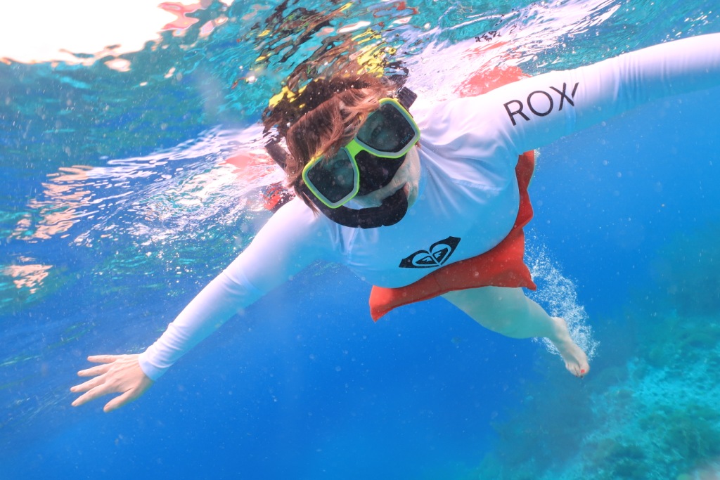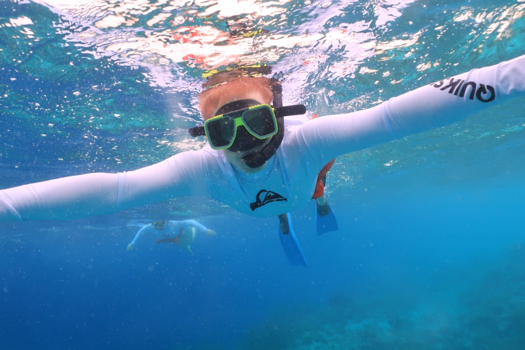 Es ist sehr spannend was man so alles unter Wasser sieht. Eine völlig andere Welt tut sich auf. Wir werden von der Strömung mitgenommen und das Schiff sammelt uns später wieder auf. Nach einer kurzen Pause dürfen wir ein zweites Mal ins Wasser. Heute ist es etwas bewölkt und es hat ganz schöne Wellen, aber unter Wasser merkt man dies gar nicht. Beim zweiten Schnorchelplatz sieht man künstlich angelegte Kunstwerke auf dem Grund auf denen sich die Korallen niederlassen sollen. Wir dümpeln eine Weile im Wasser, der Fotograf macht von allen Fotos und dann geht es wieder zurück ins Boot. Das war ganz schön anstrengend mit der Strömung zu schnorcheln. Auf dem Boot gibt es noch Rum-Punsch und schon geht es wieder zurück zur Mein Schiff 2. Das hat Spass gemacht, der Ausflug war sehr schön und wir kaufen natürlich die Fotos.