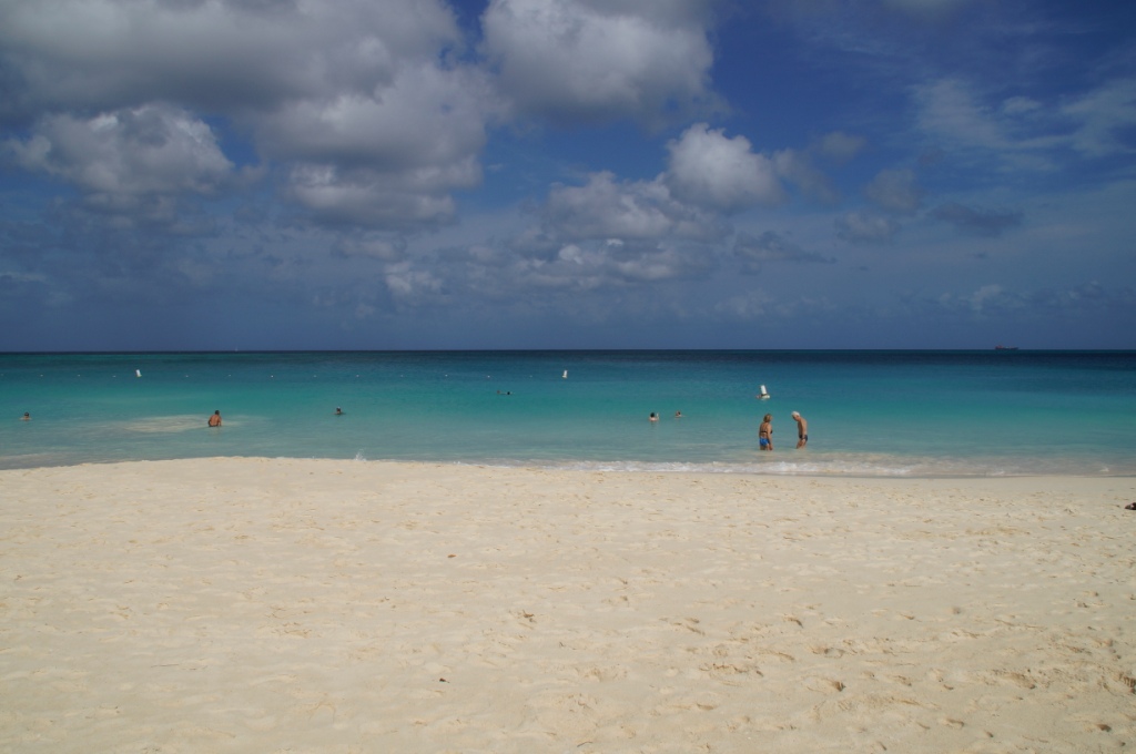 Kurze Zeit später sind wir am traumhaften Eagle Beach und suchen uns ein schönes Plätzchen. Wir wollen es uns auf den Liegestühlen eines Hotels bequem machen, wir würden ja auch etwas zahlen für den Liegestuhl, aber ein Aufseher schickt uns weg, das sei nur für Hotelgäste. Na dann, breiten wir unsere Handtücher eben im Sand aus. Das Wasser sieht herrlich aus, doch beim vermeindlich ruhigen Gewässer kommt plötzlich aus dem Nichts eine Welle und schmeisst mich um. Natürlich verliere ich meine Sonnenbrille und finde sie nicht mehr wieder. Sobald man den Rand überwunden hat, ist das Meer herrlich warm und ganz ruhig. Nur der Ein- und Ausstieg ist tückisch. Wir können auch andere Leute beobachten, die von den Wellen, die sich ab und zu bilden, überrascht werden. Wir geniessen das Bad und machen ganz viele Fotos vom Strand. Wir sehen auch einen dieser bekannten Divi-Divi-Bäume.