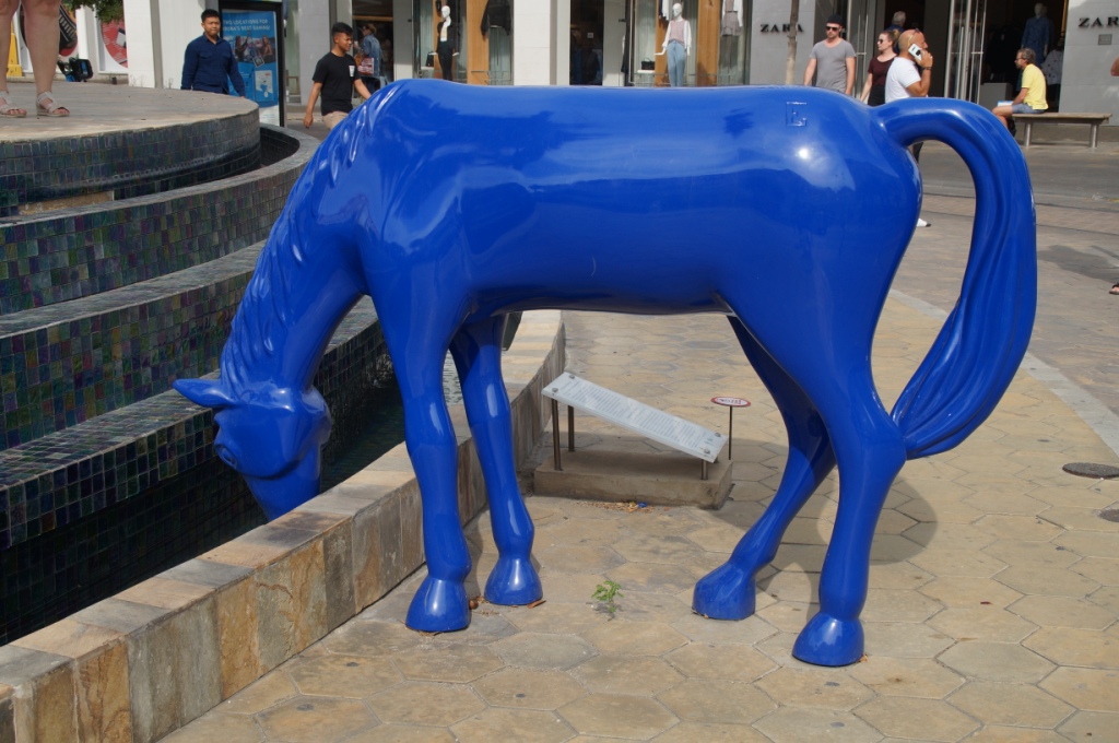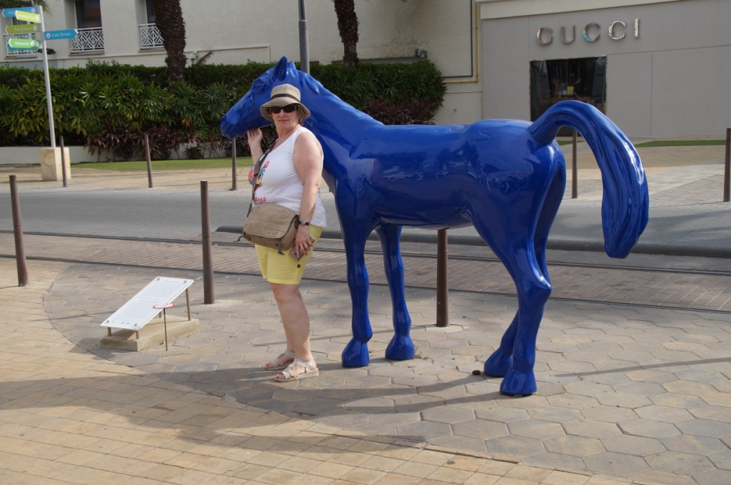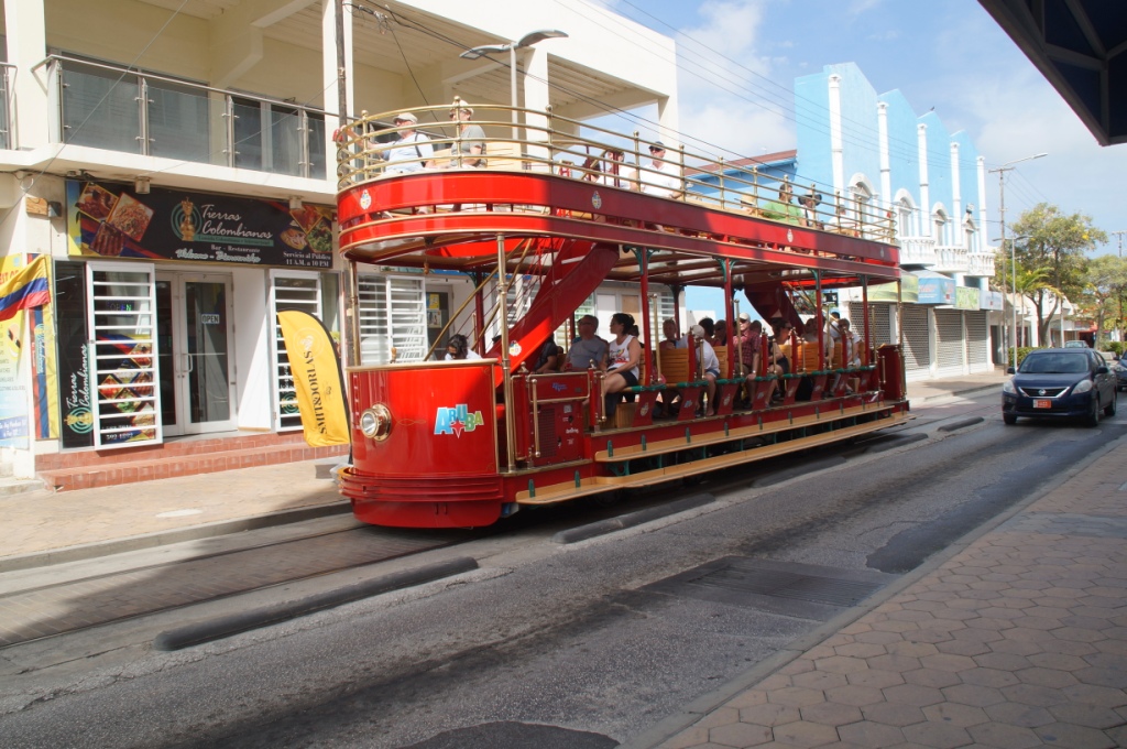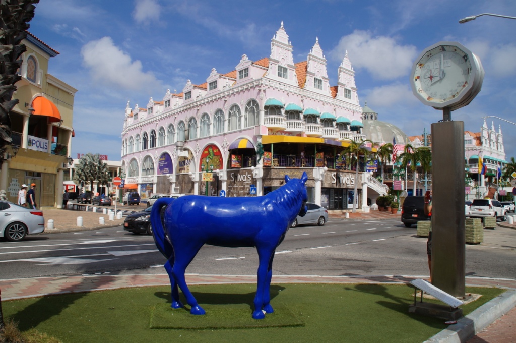Wir laufen dem Hafen entlang und fahren dann ein Stück mit der Oltimertram, die kostenlos ist. Irgendwo steigen wir aus und laufen gemütlich den Weg zurück. Überall in Oranjestad begegen uns die blauen Pferde.