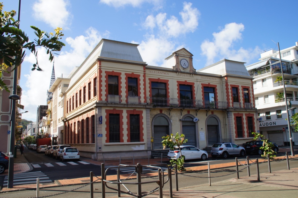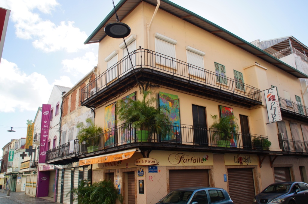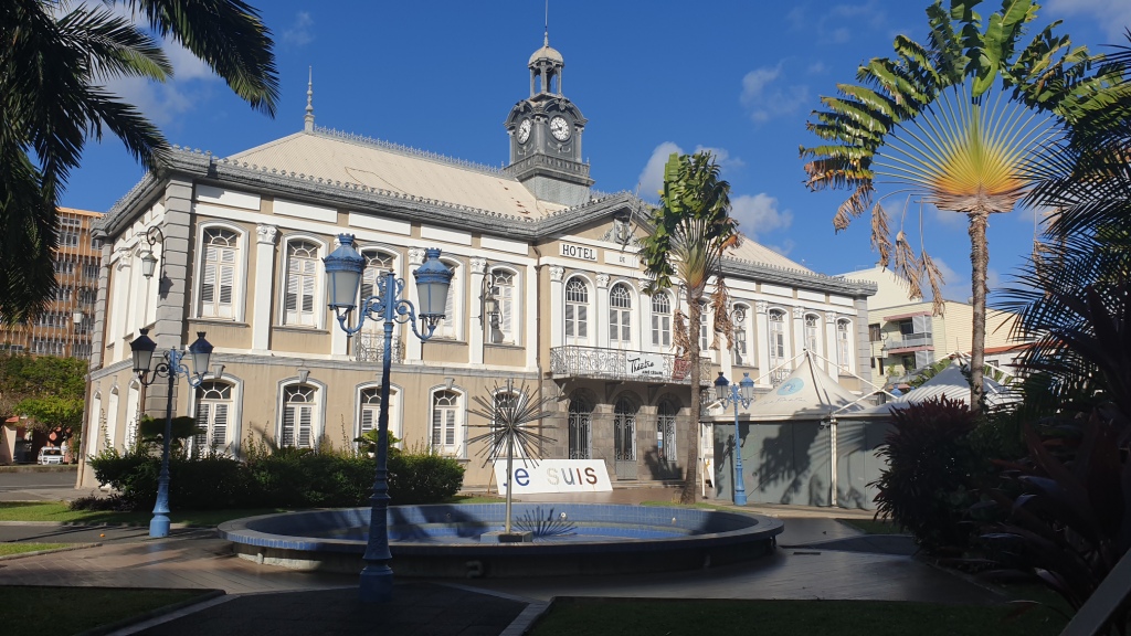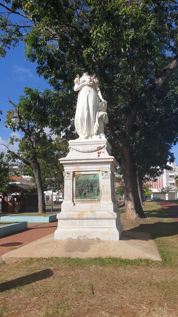Der Anlegeplatz mit der langen grünen Brücke ist gut gelegen um die Stadt zu erkunden. Leider ist am Sonntag alles geschlossen und es hat fast keine Menschen auf der Strasse. Wo sind die bloss alle? Wir kommen an der Schoelcher Bibliothek vorbei und am geköpften Denkmal der Kaiserin Josephine. Sie war beim Volk nicht beliebt, da sie die Sklaverei unterstützte, weshalb das Denkmal immer wieder beschädigt wird. Weiter geht es durch die farbigen Gassen zum Rathaus.