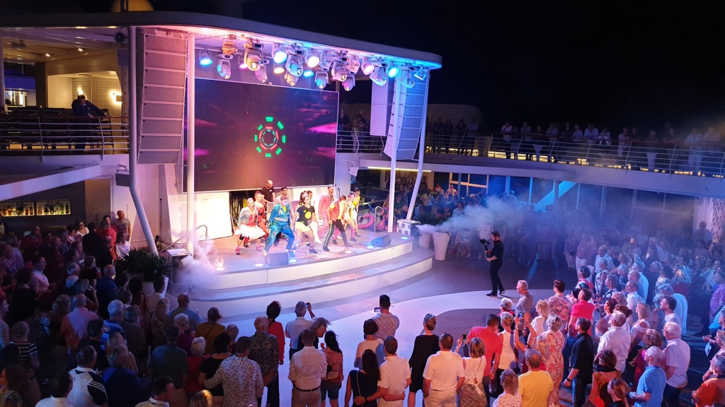 Das Auslaufen vom Hafen sehen wir uns von der Aussenalsterbar an und anschlies-send gehen wir zum Abendessen ins Atlantik Restaurant. Heute abend ist auf dem Pooldeck 80er Jahre Party. Wir sehen dem bunten Treiben vom Oberdeck aus zu.