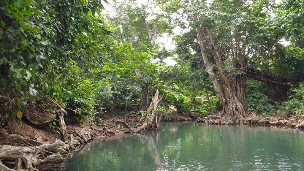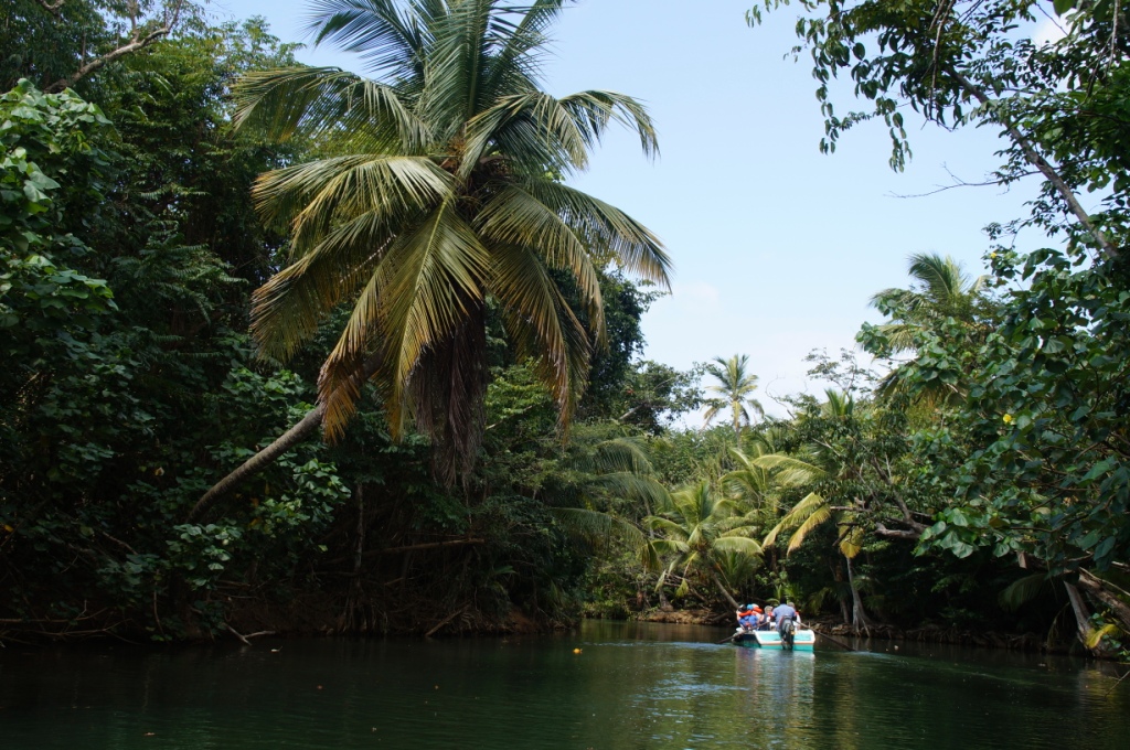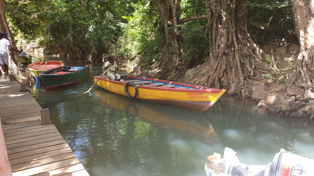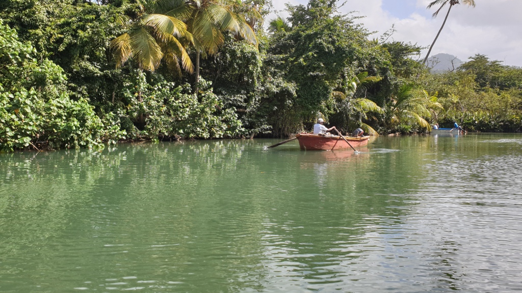 In der Bucht von Portmouth steigen wir in kleine Holzruderboote und gleiten dem Indian River entlang durch eine urwaldartige, faszinierende Landschaft. Die Natur sieht unberührt aus, überall zwitschern Vögel und es raschelt im Geäst. Nach etwa 20 Minuten kommen wir bei einer Jungelbar vorbei. Hier dürfen wir aussteigen und einen Rumpunsch verköstigen. Es gibt hier einen Garten mit vielen exotischen Blumen. Nach einem kurzen Aufenthalt steigen wir wieder in das Holzboot und werden zurück an die Anlegestelle gerudert. Von dort geht es mit dem Mini-Bus in zügigem Tempo wieder zurück zum Hafen in Roseau.