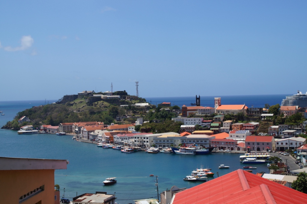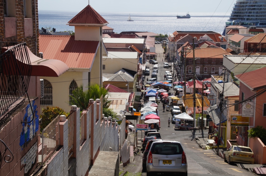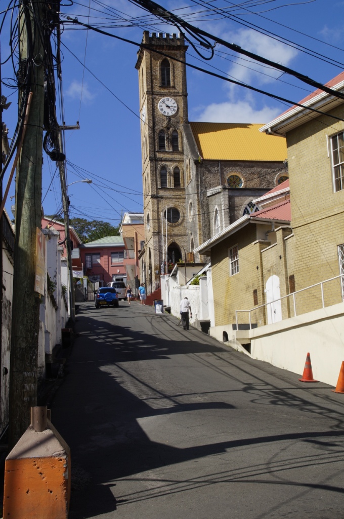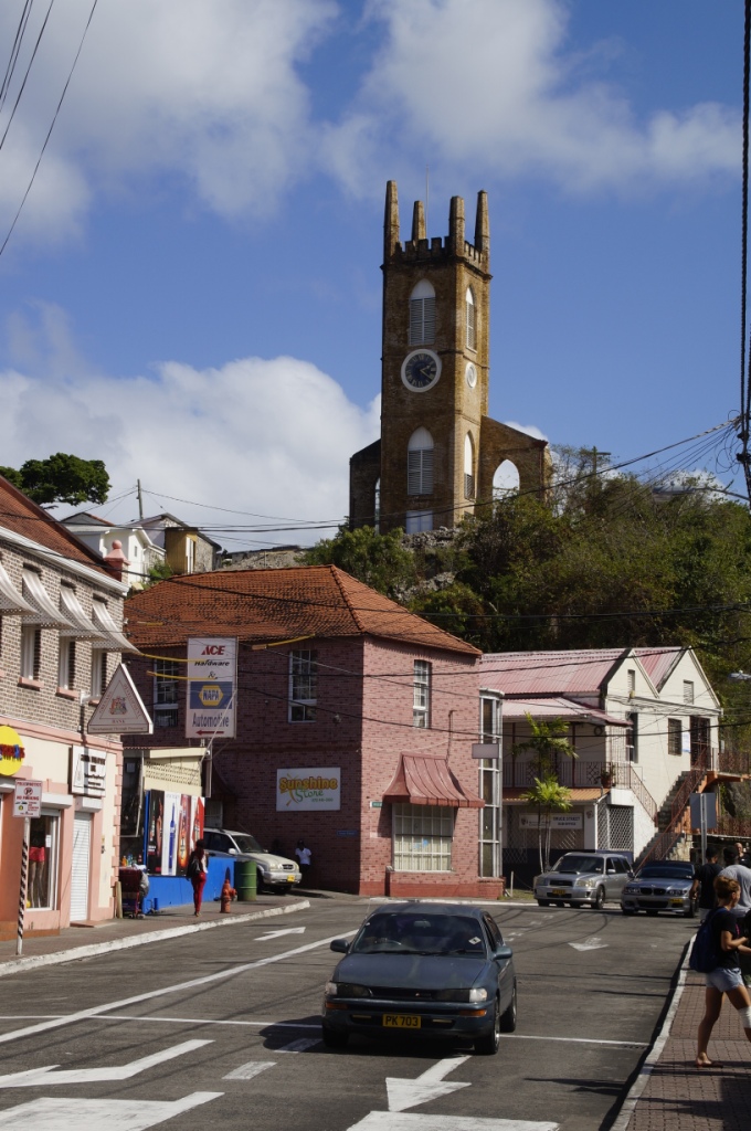 Dann laufen wir über einen Hügel, an der Kirche vorbei und steil hinab wieder zurück Richtung Hafen. Es ist heiss und wir haben keine Lust hinauf zum Fort George’s zu steigen, obwohl man von dort oben eine schöne Aussicht auf den Hafen hätte. Also stöbern wir noch ein bisschen durch die Läden am Hafen und gehen dann zurück zum Schiff.