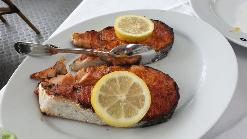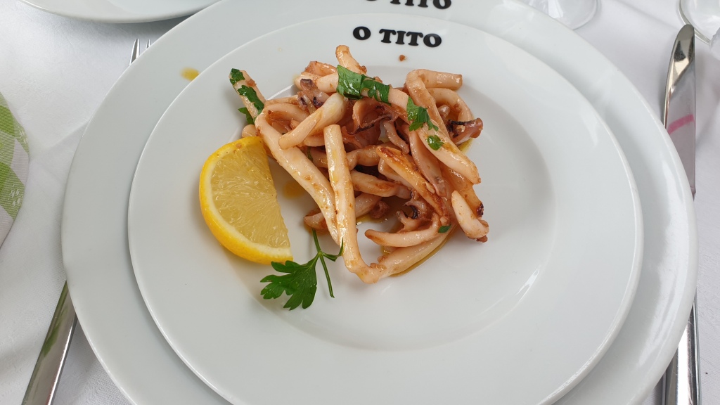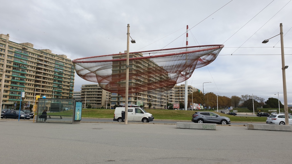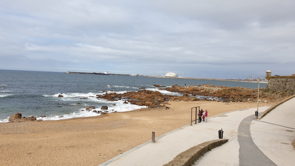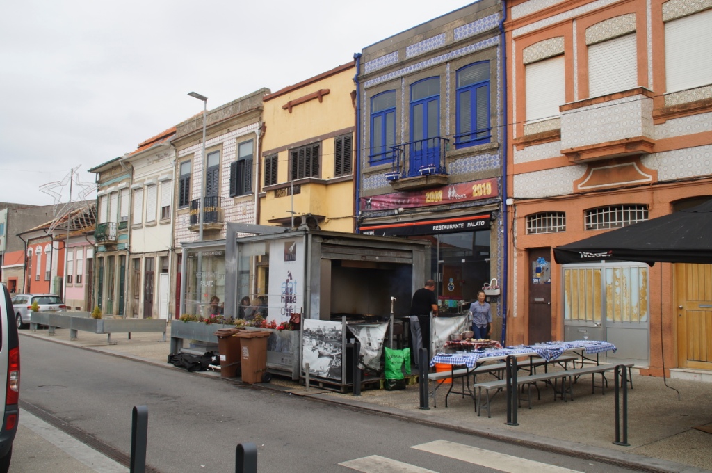 Die Hop-On-Hop-Off Touren bieten einen guten Überblick, um die Stadt fürs erste zu entdecken. Im Zentrum steigen wir dann in den anderen Hop-On-Hop-Off Bus, der zum Meer hinausfährt. Dort laufen wir dem Strand entlang nach Matosinhos und gehen dort Mittagessen in einem der Strassenrestaurants, die den Grill auf der Strasse haben. Wir essen sehr guten frischen Fisch und trinken Mateus Wein, den wir in jungen Jahren gern hatten und dann plötzlich vergessen haben. Es ist alles sehr lecker und wir geniessen diese Mittagspause am Meer.