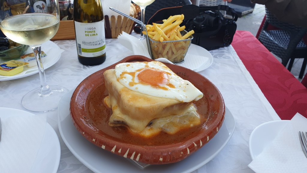 Nach der Portwein Degustation und Museumsbesuch bei Calem wollen wir noch mit der Seilbahn (Teleférico) hinauf zum Aussichtspunkt Miradouro da Serra do Pilar. Aber vorher müssen wir noch was Kleines essen. Wir entscheiden uns eine Franchesinha, eine Spezialität aus Porto, zu probieren.