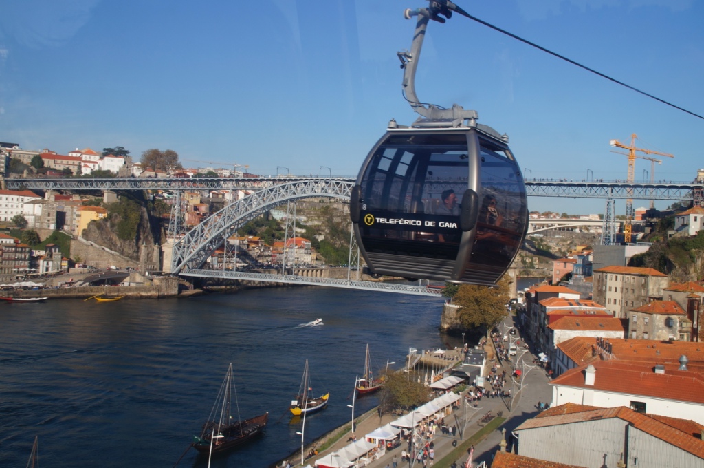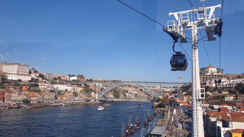 Nach diesem währschaften Snack brauchen wir noch etwas Bewegung. Zuerst laufen wir in Gaia dem Fluss entlang auf der Promenade, dann geht es aber mit der Seilbahn hoch. Wir sind ja Gondeln in den Bergen gewohnt, über den Hafen zu fahren ist aber mal was anderes, obwohl der Spass recht teuer ist für die paar Minuten Fahrt. 6 Euro ein Weg.