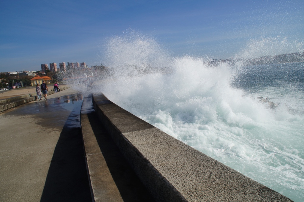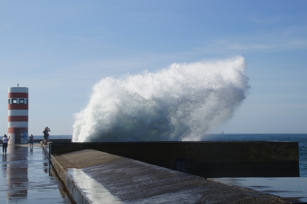 Wir laufen ganz hinaus zum Leuchtturm. Es hat hohe Wellen, die sich mit grosser Gischt am Nachbarsleuchtturm entladen. Ein schönes Schauspiel. Wenn man nicht aufpasst, kann man ganz schön nass werden. Tatsächlich kommt eine riesige Welle über die Mauer und innert Sekunden ist der Weg knöchelhoch mit Wasser bedeckt. Ich natürlich zu langsam um auf die Mauer zu springen tauche meine neuen ON Schuhe voll ins Wasser. Igitt. Nichts wie weg hier. Zum Glück sind die Schuhe leicht und trocknen recht schnell und es ist ihnen nichts anzusehen vom Malheur.