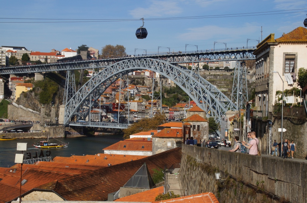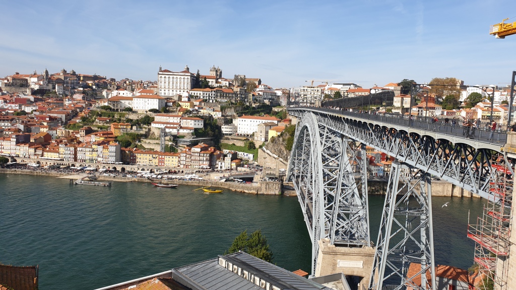 Vom Miradouro haben wir eine prächtige Aussicht auf Porto und Gaia. Wir beschliessen danach über die Brücke oben, wo das Tram fährt, hinüber zu laufen zum Hotel.